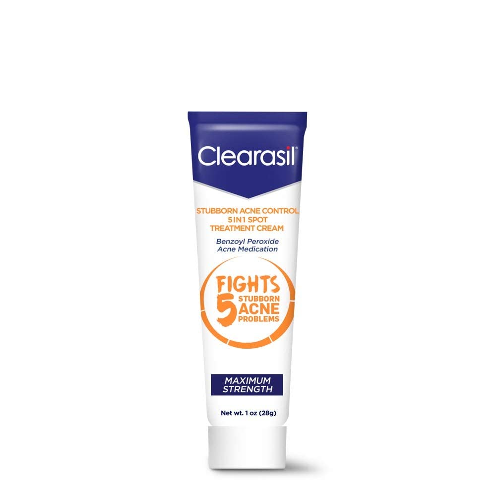 Clearasil Stubborn Acne Control 5in1 Spot Treatment Cream Maximum Strength Benzoyl Peroxide Acne Medication Fights Blocked Pores Pimple Size Excess Oil Acne Marks & Blackheads 1 oz (Pack of 11)