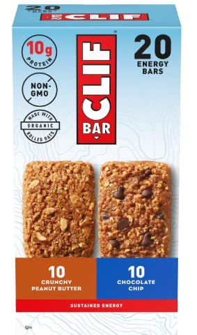 Sustained energy before or during every adventure. Non-GMO, made with organic rolled oats. 9-11 grams of protein. Two satisfying flavors: 10 Crunchy Peanut Butter and 10 Chocolate Chip. 20 CLIF BAR Energy Bars 2.4 oz. each.