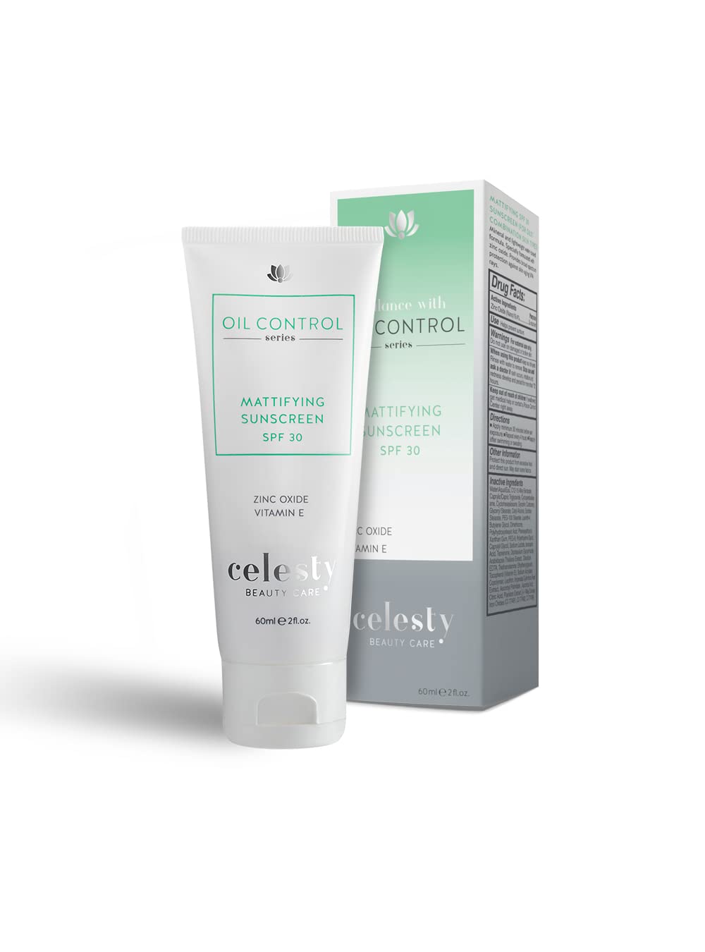 Celesty Beauty Oil-Control Sunscreen SPF 30 is a lightweight, non-greasy sunscreen designed specifically for oily, acne-prone, and sensitive skin. It delivers SPF 30 broad-spectrum protection against UVA and UVB rays, safeguarding your skin from sunburn, dark spots, and signs of premature aging. The compact 2 oz size is travel-friendly and perfect for on-the-go sun protection. Use it every day to keep your skin protected and looking fresh. With SPF 30, this sunscreen offers effective UVA and UVB protection, helping to shield your skin from sunburn, premature aging, and skin damage caused by harmful sun exposure. While controlling shine, this sunscreen also hydrates and moisturizes, keeping your skin soft and nourished without clogging pores. This lightweight sunscreen absorbs quickly into the skin, offering full sun protection without the sticky, greasy feel, making it ideal for acne-prone and sensitive skin. Infused with hydrating ingredients to lock in moisture, this sun shield ensures your oily, acne skin stays hydrated while protecting against the sun. Specially formulated for oily skin, this sunscreen provides a matte finish that controls excess shine and oil throughout the day, leaving your skin feeling smooth and non-greasy. Provides SPF 30 protection against UVA and UVB rays, preventing sunburn, premature aging, and skin damage from harmful sun exposure. Powerful Matte Solar Defence . Reflecting solar UVA And UVB solar rays formula while defence the skin against photo damage with inovativeley improved SPF 30 for oily acne skins.