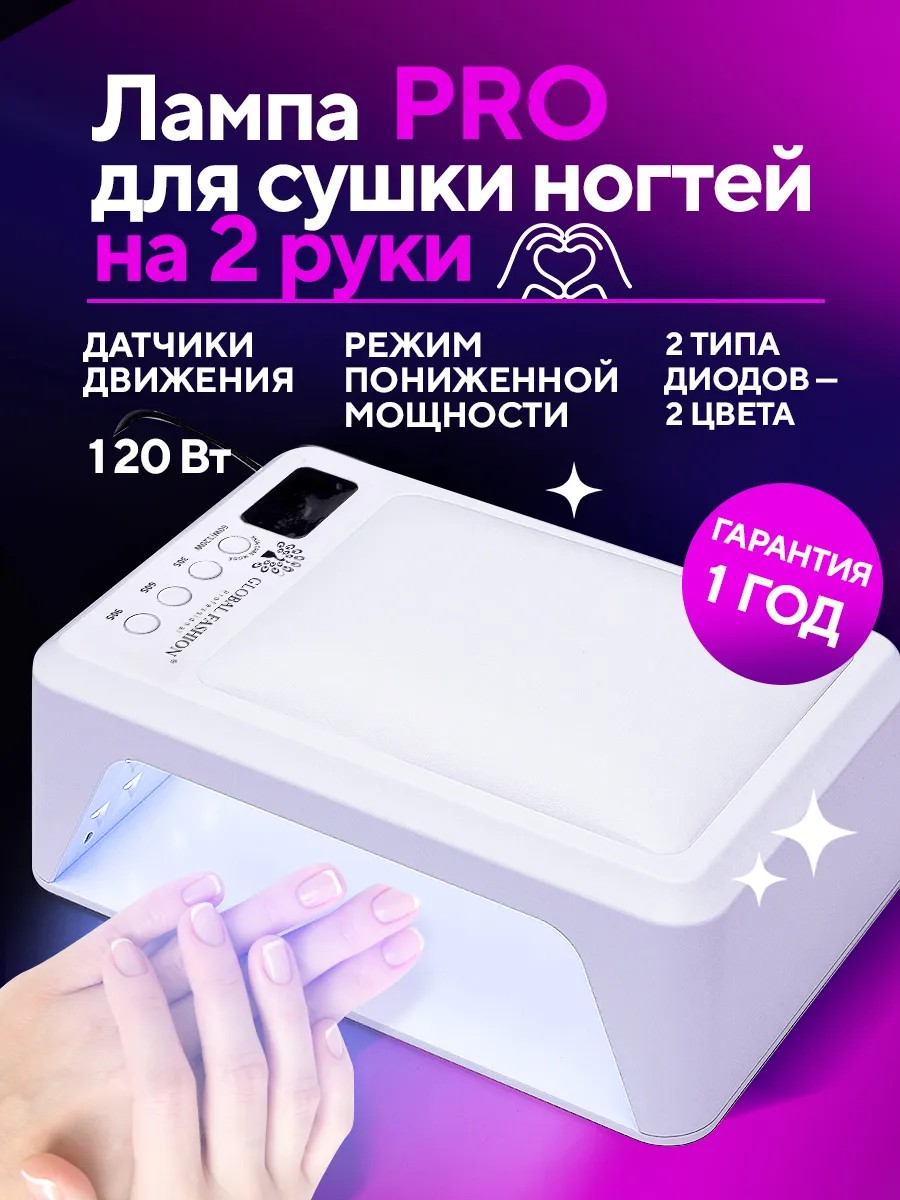 Лед лампа для ногтей Global Fashion на две руки в белом цвете. Она является идеальным инструментом для создания безупречного маникюра и педикюра. Маникюрная лампа имеет съемное дно и ударопрочный корпус. LED UV 3D (3д) лампа для маникюра является очень мощной - 120 Вт, обеспечивает маникюрный и педикюрный уход, быструю и эффективную полимеризацию гелевых, гель-лаковых и шеллаковых ногтей, наращивания ногтей и любых покрытий, в состав которых входит биогель и полигель, 3 д гель, гель-лак позволяя достичь долговременного и стойкого результата. Уф сушилка имеет мощные светодиоды, которые обеспечивают равномерное и интенсивное освещение ногтей. Это гарантирует качественную просушку любого материала. Лампа для маникюра позволяет сушить в ней две руки одновременно, сверху имеется подушка из качественного материала для удобного расположения рук клиента. УФ лампа имеет цифровой дисплей и кнопки переключения таймера на 10, 30, 60, 120 секунд, что позволяет установить оптимальное время сушки в зависимости от типа и толщины покрытия, а также желаемого времени и итогового результата. Сушилка для рук маникюрная лампа для ногтей станет отличным подарком как для начинающего, так и для профессионального мастера ногтевого сервиса.