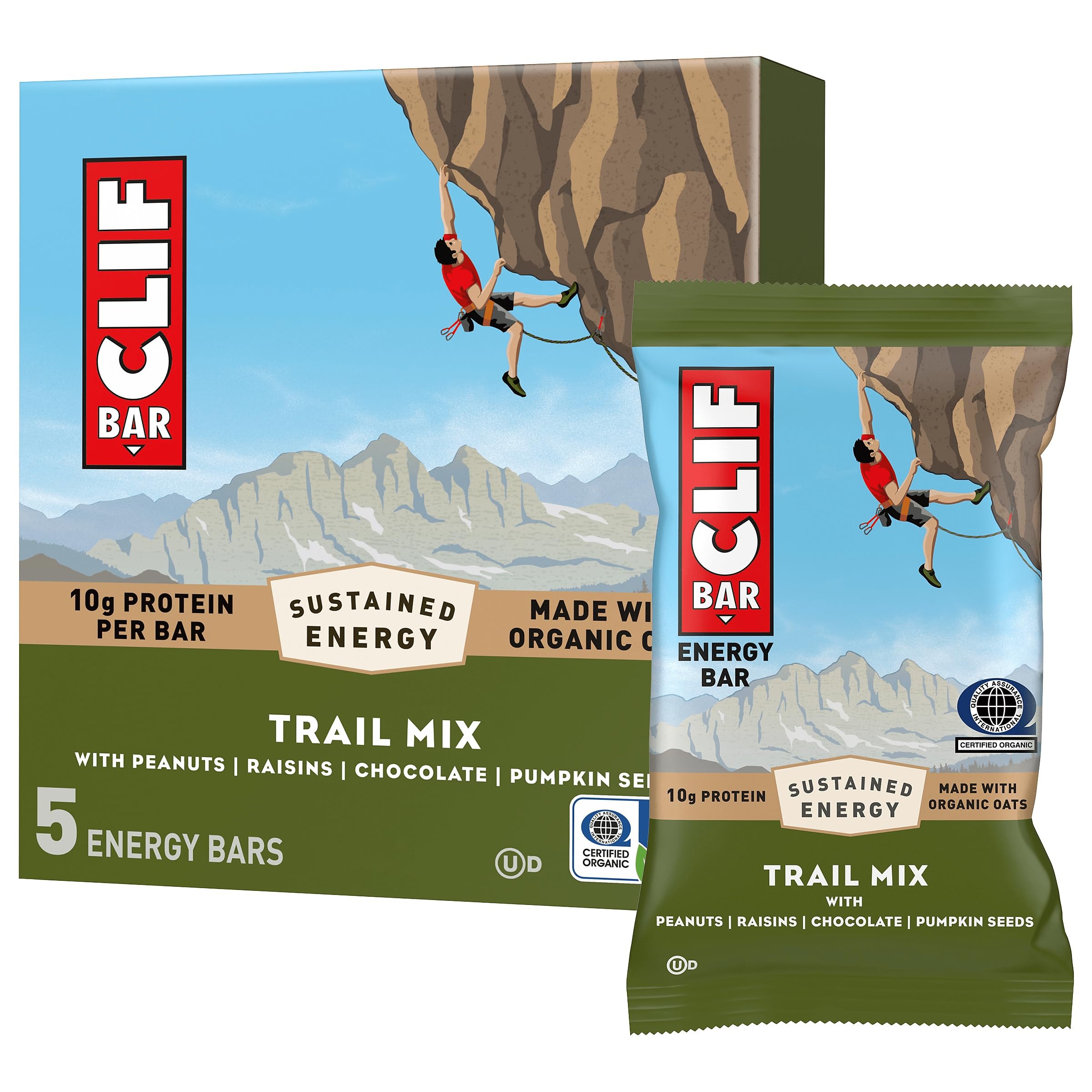 ON-THE-GO ENERGY: Individually wrapped, portable plant protein bars that provide sustained energy for hiking, running, biking, climbing, and more. CRAFTED WITH PURPOSE: Energy bar made in LEED-certified bakeries that use renewable electricity, including on-site generation and or electricity purchased through renewable energy credits (RECs). SUSTAINED ENERGY: Delicious protein snack crafted with a mix of protein, fat, and carbohydrates to sustain energy in active bodies before and during long, moderate-intensity activity. QUALITY INGREDIENTS: Non-GMO, plant based protein bars with 10g of protein per bar and containing no high-fructose corn syrup or artificial flavors. CLASSIC TRAIL MIX FAVORITE: One 5-pack box of CLIF BAR Trail Mix Energy Bars made with plant based ingredients like organic oats and sustainably sourced peanuts, raisins, chocolate, and pumpkin seeds (packaging may vary).