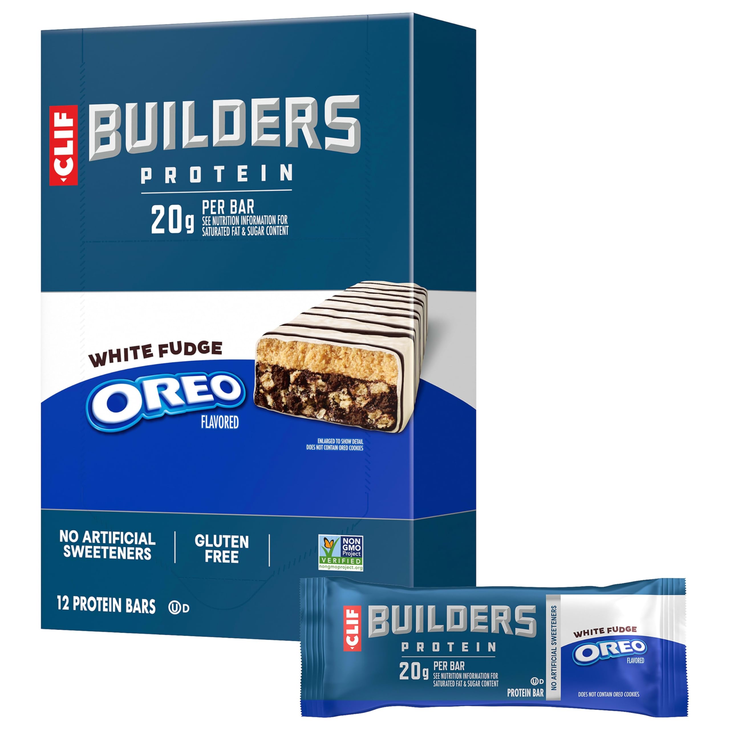 PORTABLE PROTEIN: Individually wrapped, conveniently portable on-the-go protein bars great for tossing in gym bags, backpacks, and purses when heading out the door for workouts. BUILT WITH QUALITY INGREDIENTS: Non-GMO Project Verified, low glycemic , and gluten free protein bars containing no high-fructose corn syrup or artificial sweeteners. RECOVERY AFTER WORKOUTS: High protein bars with 20 grams of plant based protein per bar plus carbohydrates to help sustain hardworking bodies and fuel recovery after training or competing. GREAT TASTE: Delicious protein bars with a crunchy texture and a flavor inspired by milk's favorite OREO chocolate sandwich cookie — in a creamy white fudge-coated edition with black cocoa drizzle. WHAT YOU GET: Twelve 2.4 oz. CLIF BUILDERS White Fudge OREO-Flavored Plant Based Protein Bars.