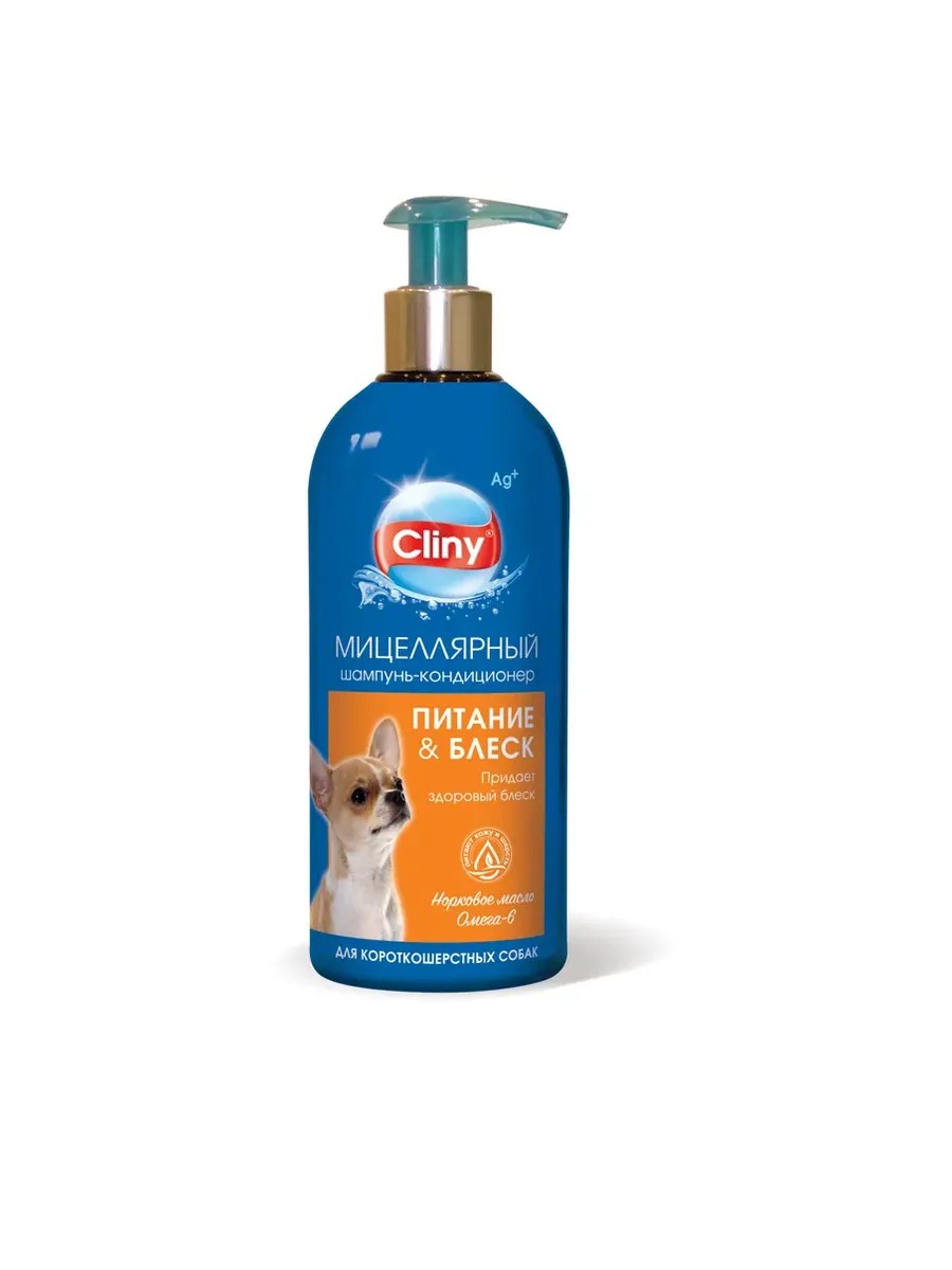 Шампунь-кондиционер Клини (Cliny) K303 для короткошерстных собак - Питание и блеск 300мл Сегодня шампунь — основное средство для ухода за кожей и шерстью питомцев. Основная функция шампуня — гигиенический уход, очищение кожи и шерсти от кожного сала, пыли и грязи. Качественные шампуни для животных совмещают как гигиенический, так и косметический уход — ухаживают за кожей и шерстью, питают и восстанавливают шерсть, сокращают линьку. Cliny — это первая серия по уходу за животными с ионами серебра. Ионы серебра обладают мощным бактерицидным действием широкого спектра, не вызывают аллергии. Cliny-гигиена — это просто! Шампуни Cliny — продукт профессионального качества. Они созданы с учётом особенностей кожи и шерсти животных: мягко очищают, ухаживают за кожей и шерстью, дают превосходный результат. Эффект посещения груминг-салона у вас дома! Для шампуней Cliny разработана специальная, легкосмываемая формула: шампунь легко распределяется и легко смывается с кожи и шерсти. Шампунь-кондиционер Cliny Роскошный шёлк разработан специально для длинношёрстных кошек: -Распутывает и сокращает линьку -Разглаживает шерсть и придает шелковистость. Порядок применения: Шампунь-кондиционер Cliny Питание и блеск не требует разведения — он сразу готов к использованию. Хорошо смочите кожу и шерсть животного, нанесите шампунь, помассируйте до образования пены и тщательно смойте. Просушите и расчешите.. Состав: Активные компоненты: -Масло арганы профилактирует образование колтунов, облегчает расчёсывание и активизирует рост шерсти. -Экстракты алоэ вера и пророщенной пшеницы (витамин Е и провитамин В5) глубоко увлажняют и питают, поддерживают гидролипидный баланс кожи. -Натуральный жидкий шёлк придает шерсти здоровый шелковистый блеск и избавляет от статического электричества. -Ионы серебра оказывают антибактериальный эффект, защищаютот воздействия патогенных бактерий