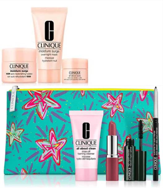 Clinique Pop Lip in Love Pop, 3.8g, High Impact Mascara in Black, 3.5ml, Quickliner For Eyes Intense in Black, .14g. All About Clean Rinse-Off Foaming Cleanser, 30ml. All About Eyes, 5ml. Moisture Surge Overnight Mask, 30ml. Moisture Surge 100H, 15ml.