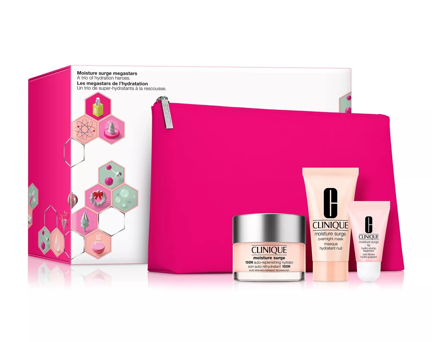 CLINIQUE Hydration megastars: a trio of hydration heroes. Hydrating Skincare Gift Set Includes: Moisture Surge 100H Self-Replenishing Moisturizer 50ml, Moisture Surge Overnight Mask 30ml, Moisture Surge Lip Hydro-Plump Treatment 7ml, Pink Gift Bag Skin Type: Suitable for all skin types, perfect for dry skin. Ingredients: Water, Dimethicone, Butylene Glycol, Glycerin, Trisiloxane, Trehalose, Sucrose, Ammonium Acryliqudimethyltaurate Vp Copolymer, Hydroxyethyl Urea, Camellia Sinensis (Green Tea) Leaf Extract, Silybum Marianum (Lady's Thistle) Extract, Betula Alba Birch Bark Extract, Beetle Lysate Extract Saccharomyces, Aloe Barbadensis Leaf Water, Aloe Barbadensis Leaf Extract, Thermus Thermophillus Ferment, Caffeine, Sorbitol, Palmitoyl Hexapeptide-12, Sodium Hyaluronate, Caprylyl Glycol, Oleth-10, Sodium Polyaspartate Eaten, Aloe Barbados. ensis leaf polysaccharides, lactobacillus ferment lysate, saccharide isomerate, hydrogenated lecithin, tocopheryl acetate, C10-30 alkyl acrylates acrylate, polyglyceryl methacrylate, tromethamine, Peg-8, hexylene glycol, magnesium ascorbyl phosphose. Phate, citric. Acid, Bht, Disodium Edta, Sodium Citrate, Potassium Sorbate, Sodium Benzoate, Phenoxyethanol, Red 4 (Ci 14700), Yellow 5 (Ci 19140)Pink gift bag. Moisture Surge Lip Hydro-Plump Treatment 7 ml. Moisture Surge Overnight Mask 30 ml. Moisture Surge 100H Self-Replenishing Moisturizer 50 ml. A trio of hydration heroes. CLINIQUE Megastars de l'hydratation : un trio de héros d'hydratation. Le coffret cadeau de soins de la peau hydratant comprend : hydratant auto-régénérant Moisture Surge 100H 50 ml, masque de nuit Moisture Surge 30 ml, traitement Moisture Surge Lip Hydro-Plump 7 ml, sac cadeau rose Type de peau : Convient à tous les types de peau, parfait pour les peaux sèches. Ingrédients : eau, diméthicone, butylène glycol, glycérine, trisiloxane, tréhalose, saccharose, ammonium acryliqudiméthyltaurate copolymère Vp, hydroxyéthyl urée, extrait de feuille de camélia sinensis (thé vert), extrait de silybum marianum (chardon de lady), Betula Alba Extrait d'écorce de bouleau, extrait de lysate de Saccharomyces, eau de feuille d'aloe barbadensis, extrait de feuille d'aloe barbadensis, ferment Thermus Thermophillus , caféine, sorbitol, palmitoyl hexapeptide-12, hyaluronate de sodium, caprylyl glycol, Oleth-10, polyaspartate de sodium Mangé, Aloe Barbade. ensis polysaccharides feuilles, lysate de ferment lactobacillus, isomérate de saccharide, lécithine hydrogénée, acétate de tocophéryle, acrylates acrylate d'alkyle C10-30, polyméthacrylate de glycéryle, trométhamine, Peg-8, hexylène glycol, magnésium ascorbyl phosphose. Phate, citrique. Acide, Bht, disodium Edta, citrate de sodium, sorbate de potassium, benzoate de sodium, phénoxyéthanol, rouge 4 (Ci 14700), jaune 5 (Ci 19140)Sac cadeau rose. Moisture Surge Lip Hydro-Plump Traitement 7 ml. Masque de nuit Moisture Surge 30 ml. Hydratant auto-régénérant Moisture Surge 100H 50 ml. Un trio de héros d'hydratation.
