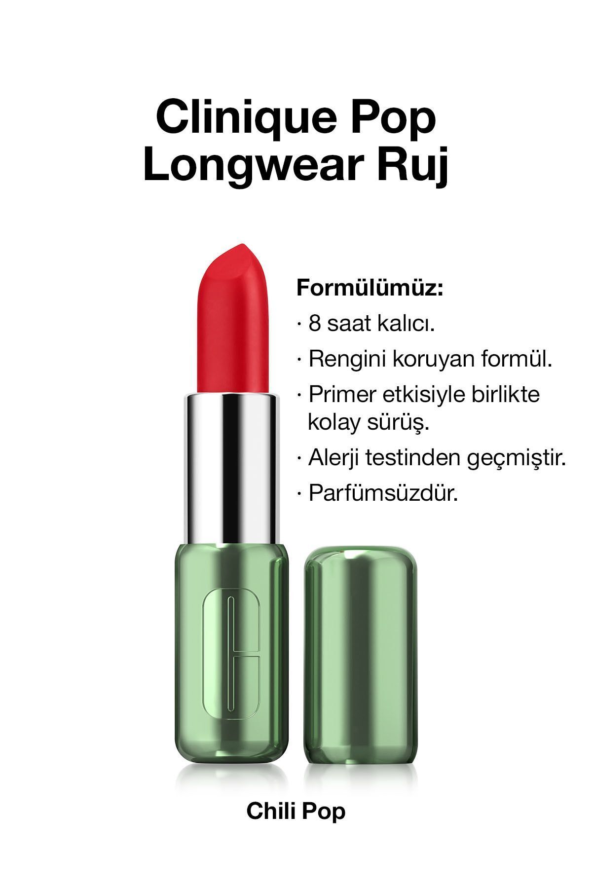 Yeni ambalaji, gün boyu kalici 24 farkli renk ve 3 farkli bitis seçenegiyle her gün tüm gün, ihtiyacin olan tek ruj: Clinique Pop Longwear Ruj . Bitis: Saten, Mat ve Parlak Bitis SeçenegiKapaticilik: Tam Nedir? Her gün tüm gün, ihtiyacin olan tek ruj: Clinique Pop Longwear Ruj . 24 farkli renk ve 3 farkli bitis seçenegiyle: Saten, Mat veya Parlak. Ne ise yarar? Zengin pigmentli yogun renkli formülü pürüzsüz bir uygulama ve konforlu bir deneyim için primer etkisiyle bir arada. Kolayca sürülür ve her uygulamada ultra pigmentli renk tam kapaticilik sunar. Tüm dudak renkleri cilt tonlarinin yani sira tüm makyaj görünümlerine uyum saglayabilecek genis bir renk seçenegine sahiptir. Ruh haline ve makyaj görünümüne göre seçebilecegin 3 farkli bitis seçenegi bulunur: saten, mat veya parlak bitis. 8 saat boyunca rengini koruyan kalici formülüyle tüm gün kullanim için idealdir. Ayni Formül. Yeni Ambalaj. En sevilen üç Pop Rujun formülünü, yeni ambalajlariyla bir araya getirdik. Simdi yeni ambalajlari ve daha genis renk seçenekleriyle favori Clinique PopTM rujunu kesfet! Formülümüz: • 8 saat kalici.• Rengini koruyan formül.• Primer etkisiyle birlikte kolay sürüs.• Alerji testinden geçmistir.• Parfümsüzdür. Nasil Kullanilir: • Dogrudan dudaklarina uygulayabilirsin. • Daha belirgin bir görünüm için Quickliner™ for Lips Dudak Kalemi ile beraber kullanabilir veya Clinique Pop™ Lip Gloss'u üstüne uygulayarak daha isiltili bir görünüm yakalayabilirsin.