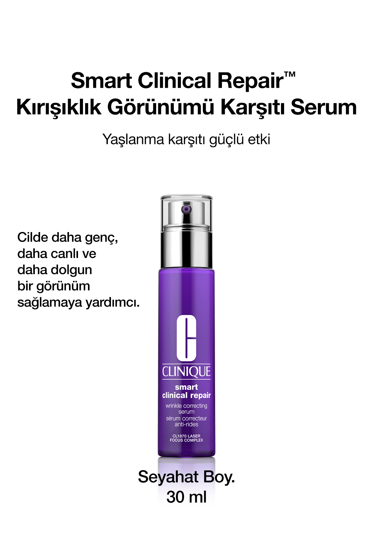 Yeni Clinique Smart Clinical Repair™ Serum'u kesfet. Kirisiklik görünümünü birçok açidan hedef alan lazer odakli klinik serum. Ince çizgi ve inatçi kirisiklik görünümünün azalmasina destek olan bu mükemmel formül, üç sonucu elde etmek için tasarlandi: Cilde onarilmis, yenilenmis ve dolgun bir görünüm saglamaya yardimci olmak.