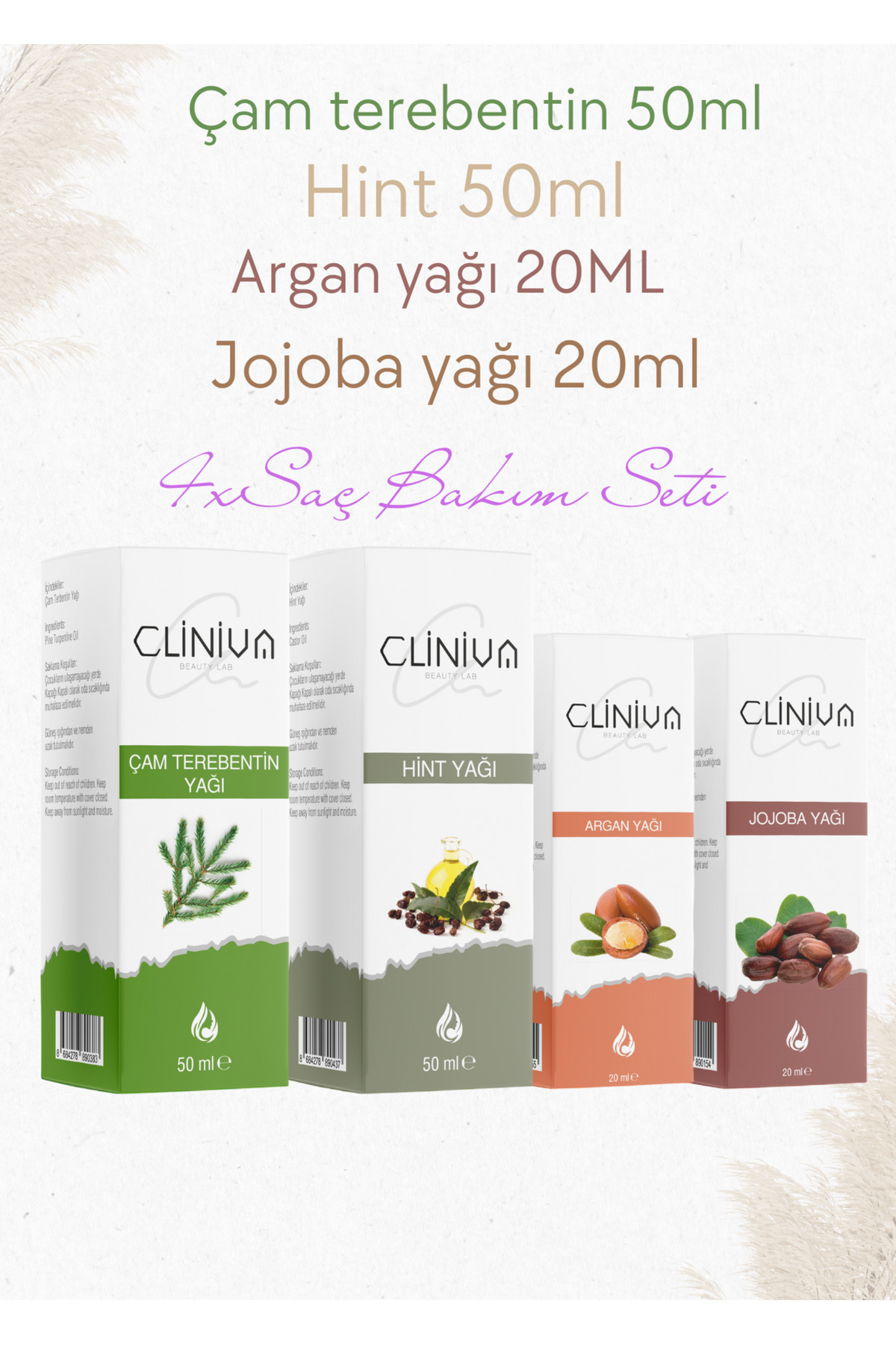 - This set containing four different natural oils that will enrich your hair care routine provides deep care for your hair. - These oils, each offered in volumes ranging from 76 to 100 ml, provide your hair with the moisture and nutrition it needs. - While pine turpentine protects your hair with its natural antioxidant properties, castor oil increases blood circulation by massaging the scalp. - Argan oil restores the natural shine and softness of the hair, while jojoba oil protects and repairs the moisture balance of the hair. A set containing four different natural oils that will enrich your hair care routine: pine turpentine, castor, argan and jojoba oils It provides the moisture and repair your hair needs, strengthens the hair strands and adds shine It supports your hair health by diversifying your hair care routine thanks to the unique properties of each oil It allows you to provide natural care to your hair without damaging it with its natural ingredients