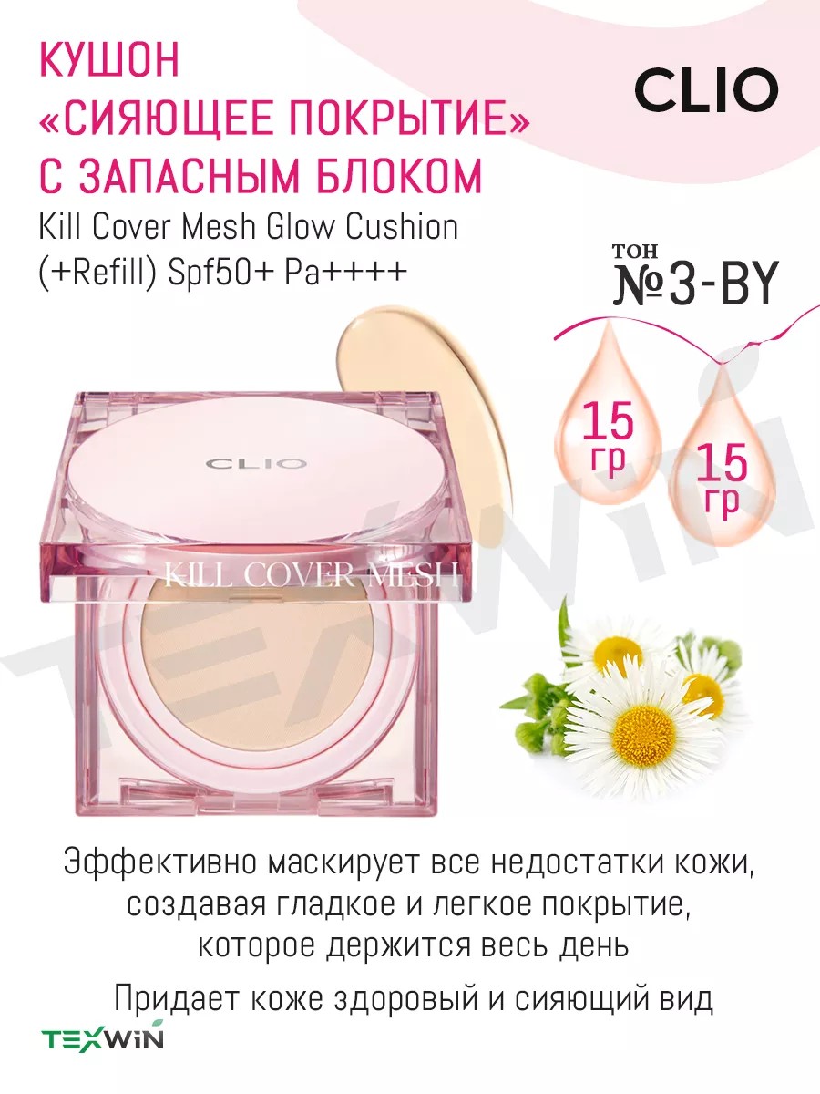 Clio Kill Cover Mesh Glow Cushion (+Refill) Spf50+ Pa++++ №3-BY LINEN — кушон с запасным блоком, эффективно маскирует все недостатки кожи, создавая гладкое и легкое покрытие, которое держится весь день.