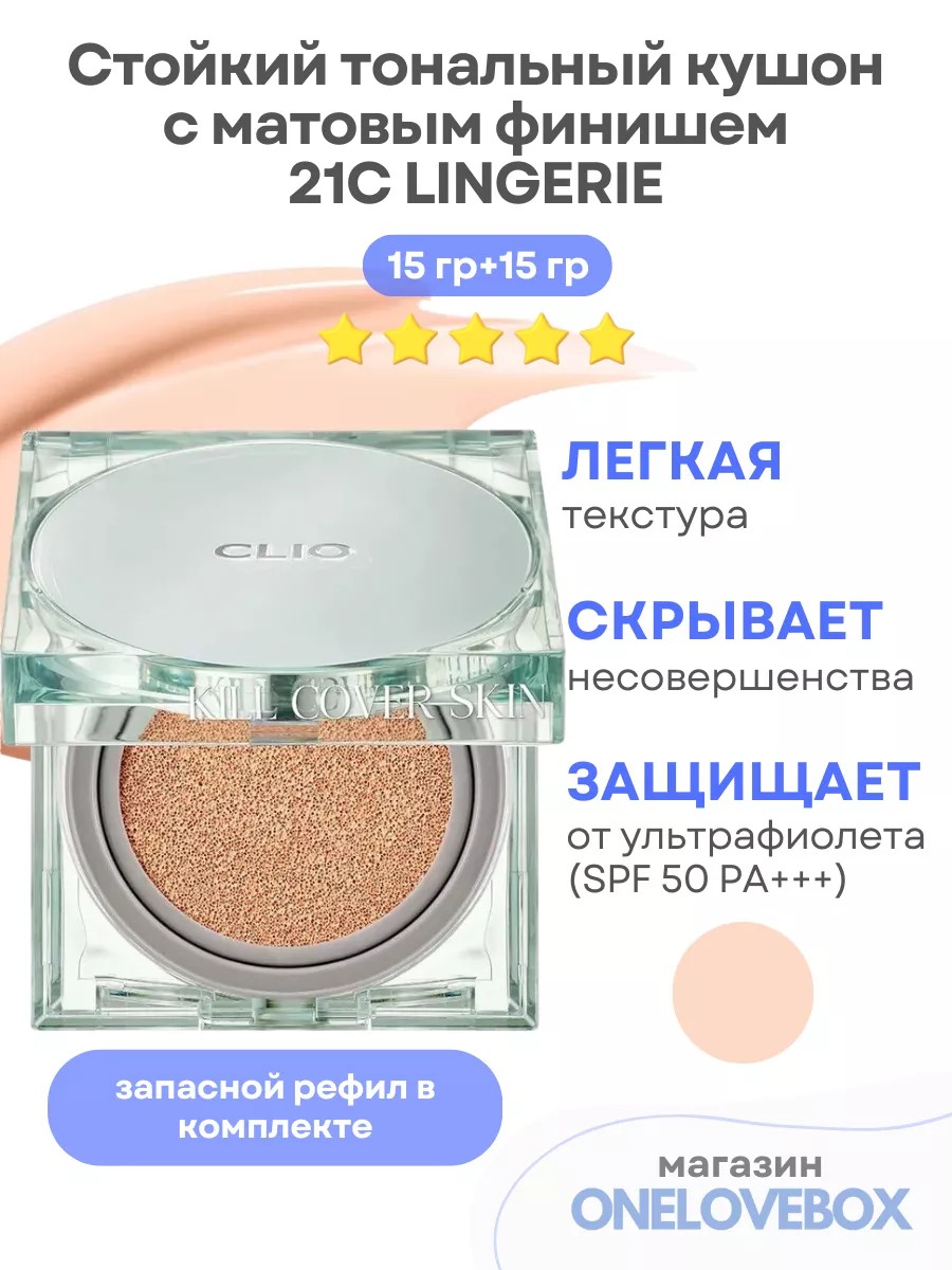 Стойкий фиксирующий корейский кушон CLIO Kill Cover Skin Fixer Cushion SPF50+ PA+++ с матовым финишем делает кожу гладкой и бархатистой.