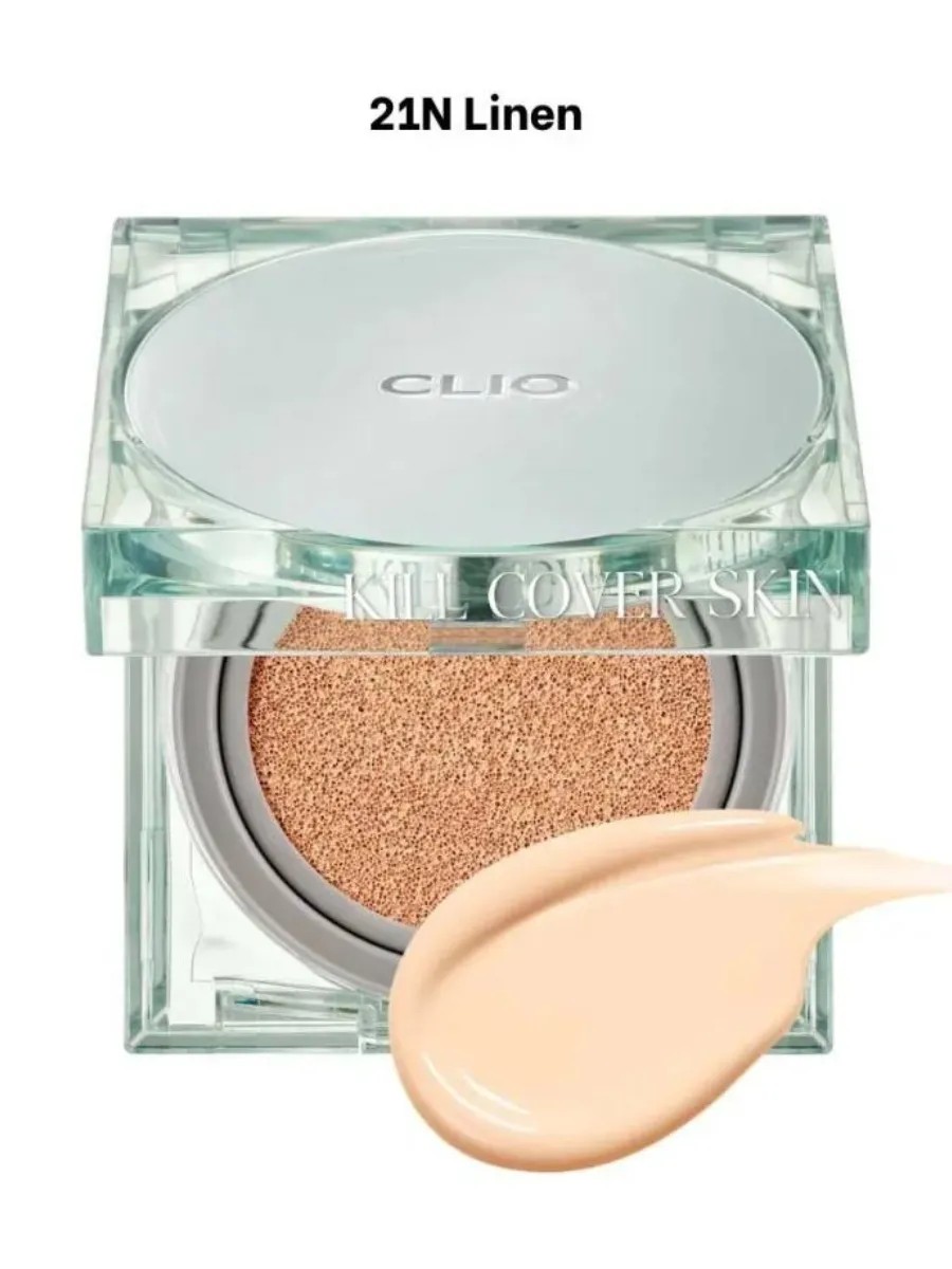 The Kill Cover Skin Fixer Cushion SPF 50+ PA+++ in 21 N Linen from Clio is a high-quality makeup product that combines foundation, skincare, and sun protection.
