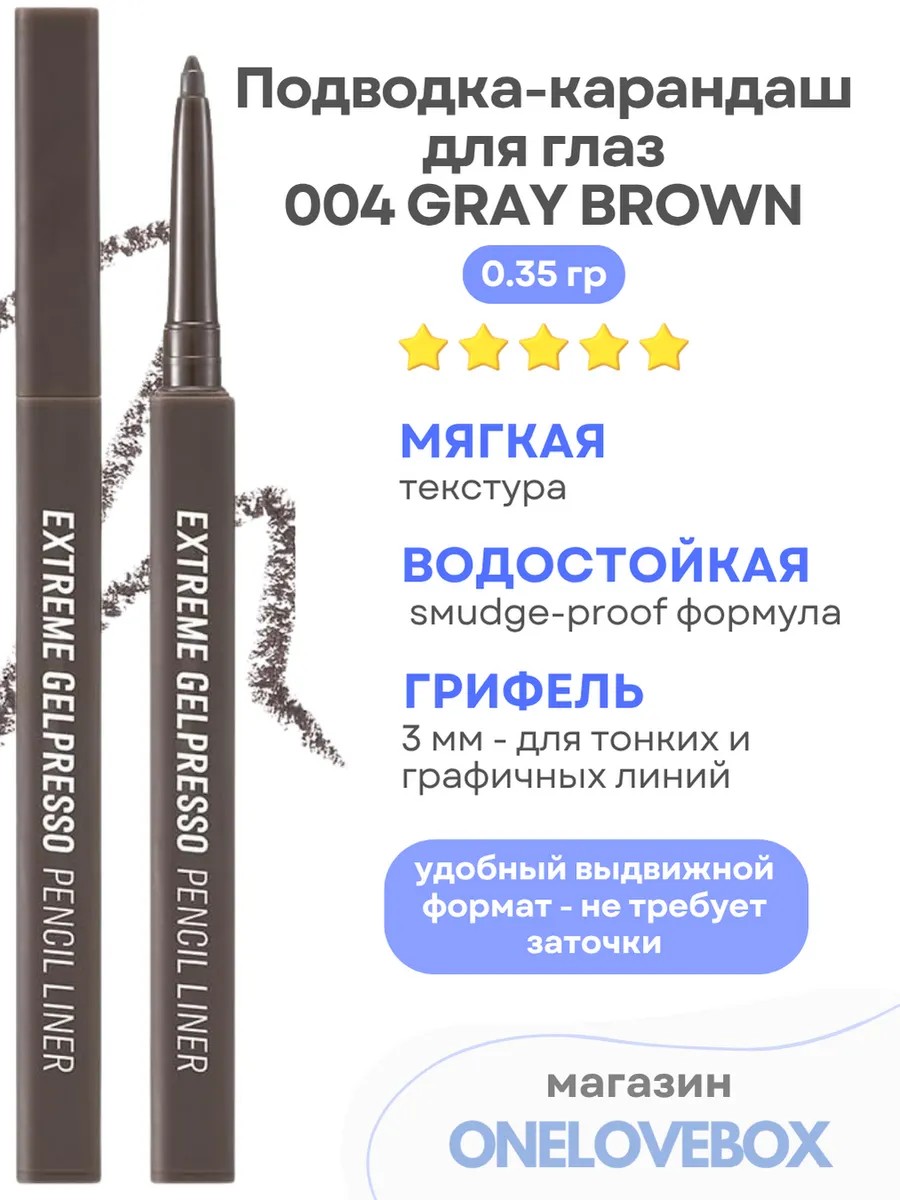 Extreme Gelpresso Pencil Eyeliner от Clio - это выдвижной гелевый карандаш, который обеспечивает насыщенный, стойкий цвет одним движением. Подходит для чувствительной кожи век, легко наносится и идеально подчёркивает глаза - от натурального макияжа до выразительных стрелок.