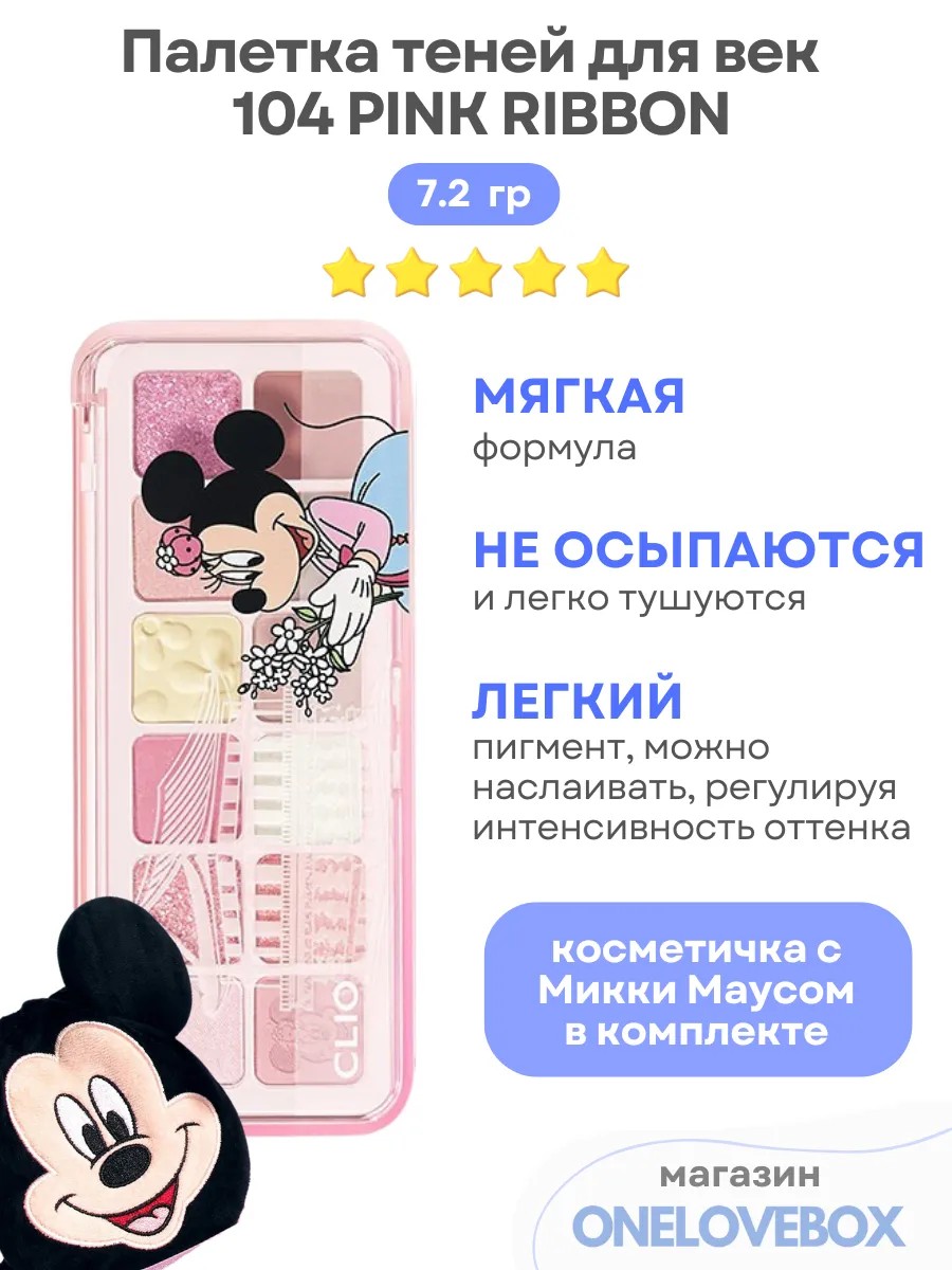 Линейка Pro Eye Palette, В коллаборации с Микки Маусом. В комплекте с тенями идёт косметичка с Микки Маусом. Pro Eye Palette Air от Clio - это универсальная палитра для глаз, предлагающая множество оттенков, идеально подходящих для ежедневного макияжа. Каждая палитра содержит двенадцать легко растушевываемых оттенков с матовой, блестящей и мерцающей текстурой. Обеспечивают стойкость благодаря своей несмазывающейся и не размазывающейся формуле. Позволяет легко растушевывать и накладывать слои для бесшовного нанесения. Идеален для создания как повседневных естественных образов, так и гламурных вечерних образов.
