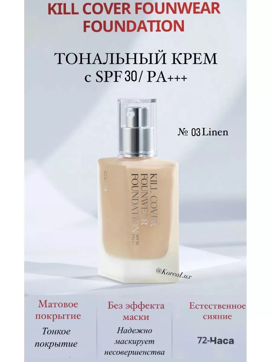 Clio Kill Cover Founwear Foundation No. 03 Linen. This matte-finish face cream features a light, fluid texture that creates comfortable yet dense coverage with long-lasting wear. This Korean foundation helps even out skin tone, conceal pores and imperfections, and protects skin from the sun and premature wrinkles. This Korean foundation is perfect for creating a flawless everyday makeup look, and thanks to adenosine and niacinamide, it improves skin tone and improves its smoothness. This premium foundation features an innovative formula and texture for flawless, imperfection-free makeup and protection from UV rays and their harmful effects. This matte face cream applies easily with fingertips or a sponge, spreading and providing coverage without excess shine, pilling, stickiness, or an unpleasant mask-like sensation on the skin. This sunscreen does not leave contours and adapts to your skin tone. For best results, apply over a makeup primer. Contains plant extracts that provide powerful antioxidant, anti-inflammatory, and soothing effects. This high-quality foundation is a useful gift for a girl or woman who wants to create a flawless look and highlight their individuality.