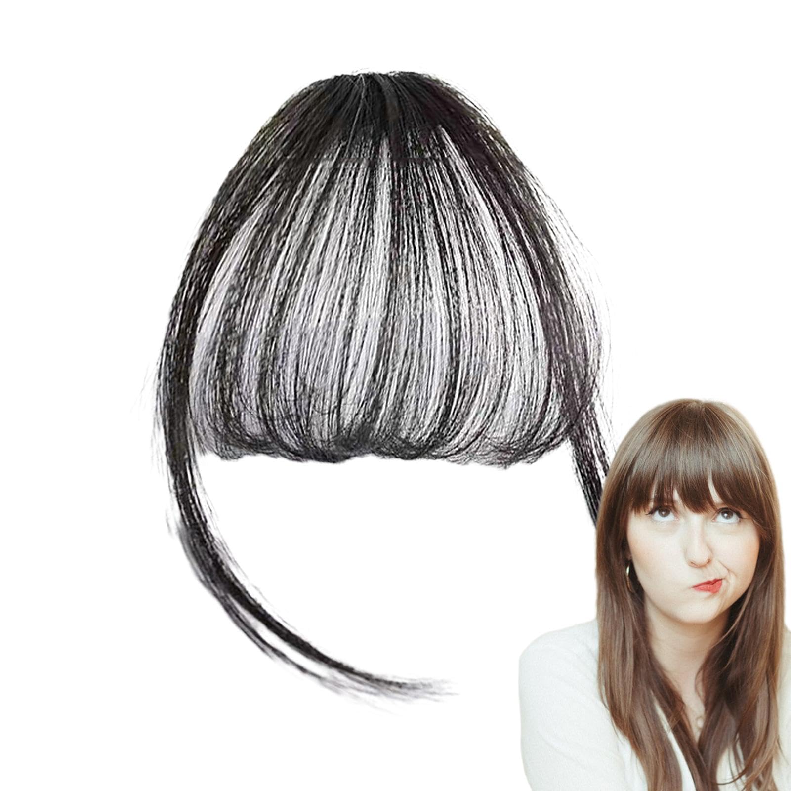 Its sturdy strips make it long-lasting and lightweight. This hairpiece is perfect for dates, parties and weddings. fiber air bangs Applicable people: women Hair : high temperature wire Applicable skin color: natural skin color Applicable face shape: any face shape Bang type: straight or slanted Effect: Change hairstyle Features: Natural and lifelike Bangs length: 13cm/5.12 inches Sideburns: 23cm/9.06 inches list: Clip in Bangs x1 DIRECTIONS 0