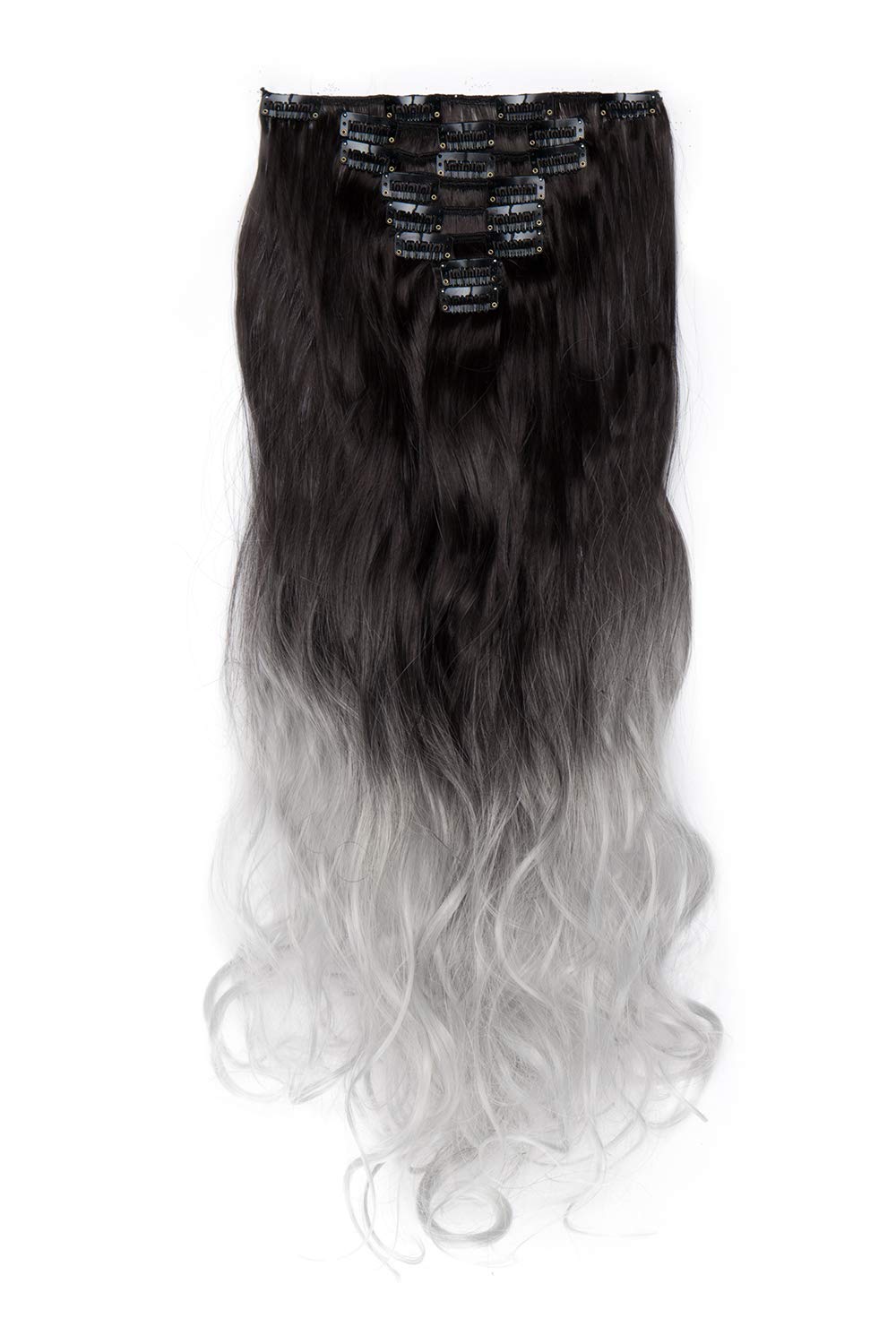 Clip in Extensions Haarverlängerung wie Echthaar Synthetik Haarteil 8 Tresssen 18 Clips für Komplette Voller Kopf Hair Extensions 60cm Gewellt Dunkelbraun bis silbergrau
