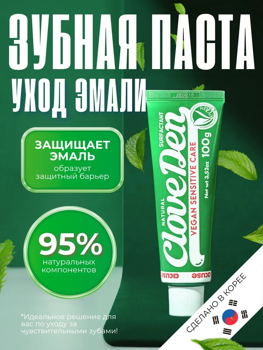 Корейская зубная паста CloveDen Vegan Sensitive Care 100 грамм идеальное решение для людей с чувствительными зубами и деснами, увлажняющая формула предотвращает сухость во рту, обеспечивая освежающее дыхание в течение дня. Подходит для всех - веганский бренд, использующий только высококачественные органические ингредиенты! В состав входят нитрат калия и гидроксиапатит, которые образуют защитный барьер на открытом дентине, снижая чувствительность и способствуя реминерализации. Профилактика кариеса и заболеваний десен: содержит 1000 ppm фторида для эффективной борьбы с бактериями. Натуральные эко компоненты: гвоздичное масло известное своими антибактериальными и успокаивающими свойствами, и масло чайного дерева - противовоспалительным действием, что гарантирует комплексный уход за полостью рта.