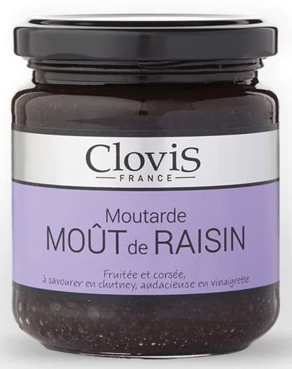 CLOVIS FRANCE - Red Grape must Mustard - 2 x 7.05oz / 200gr Glass Jar * Fruity and full-bodied, to savor in chutney, daring in vinaigrette. Made from a mixture of whole mustard seeds and grape must, this mustard will surprise your kitchen! To reveal all their flavors, the seeds are soaked in grape must for a whole day to be sips. Scents of spices, red fruits, sweet flavor, these are the characteristics of this original and colorful product. Grape must mustard is the mustard of choice for great chefs who care about quality products. It can be used with imagination in vinaigrette or mayonnaise. This mustard is ideal with white meats, game, duck breast and can also be used as a confit with foie gras.