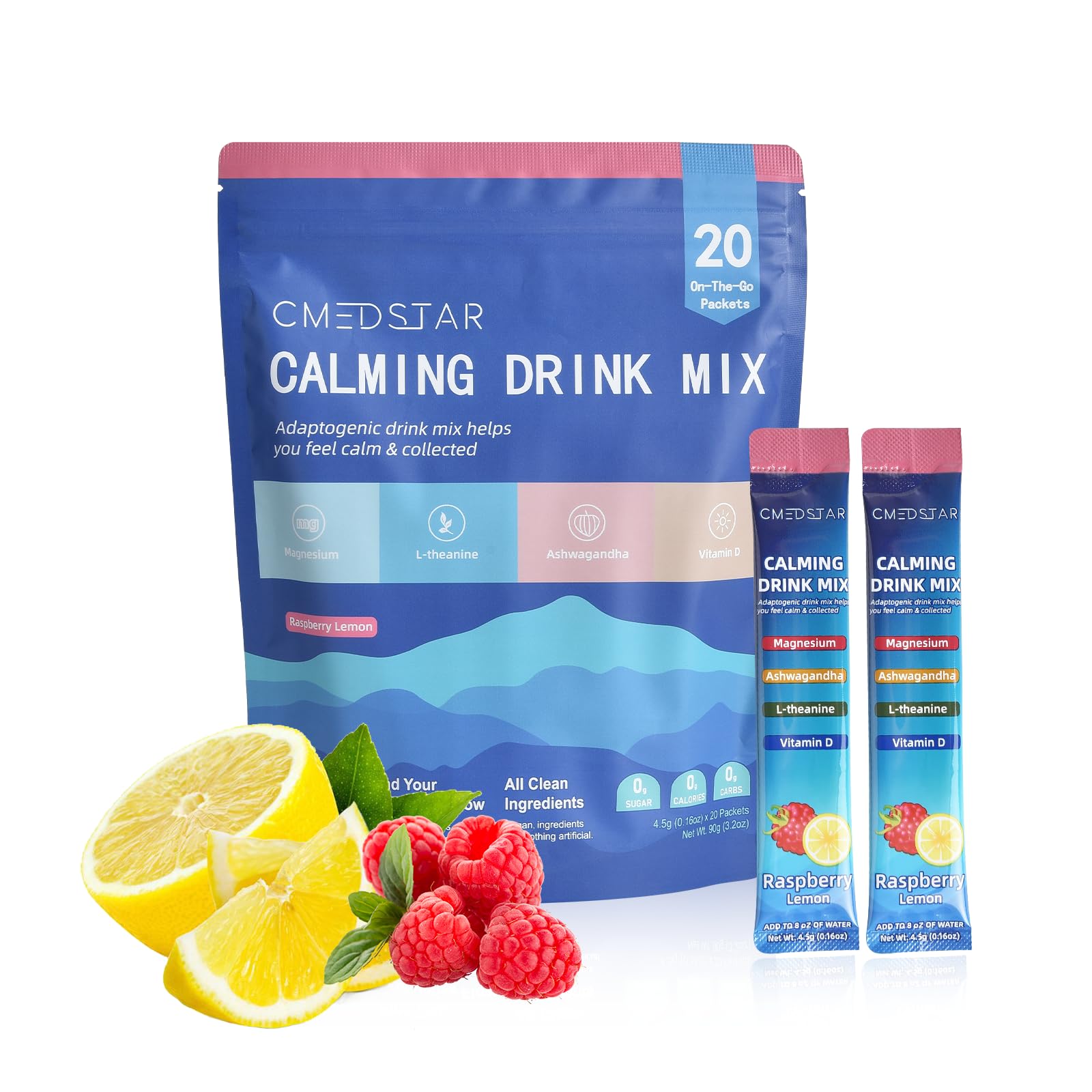 CLEAN INGREDIENTS: Relax and focus with just one bar daily. Delivering pure, transparent nutrition facts you can trust. Non-GMO, sugar-free, 0 calories, 0g carbohydrates, and no artificial additives, this is a daily drink you can trust. NOURISH MIND BODY: CMEDSTAR Calming Powdered Drink Mix is a delicious blend of vitamins, minerals, and botanicals that support mind and body, helping you improve focus, enhance your overall sense of well-being, and optimize your mental and physical well-being. IMPROVE YOUR SLEEP: Get the deep, restorative sleep your body craves. CMEDSTAR not only tastes great, but it's also packed with carefully selected ingredients like ashwagandha, theanine, and magnesium glycinate to help you fall asleep faster, sleep deeper, and wake up feeling refreshed and energized. HARMONIZE YOUR WELL-BEING: Our Raspberry Lemon formula is carefully formulated to help you maintain your body's inner balance and harmony. CMEDSTAR blends the best of nature with the wisdom of science to gently support your body's natural rhythms. REFRESH, RELAX, REFOCUS: CMEDSTAR Calming Powdered Drink Mix helps you easily find moments of relaxation and focus anytime, anywhere. Available in a variety of on-the-go packets and multi-serving cans, the refreshing and delicious raspberry lemon flavor makes it easy to support energy and balance in your busy life.