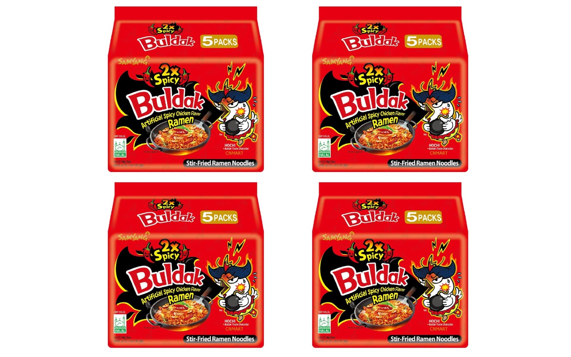 While we work to ensure that product information is correct, on occasion manufactures may alter their ingredient lists. Actual product packaging and materials may contain more and or different information than that shown our web site. We recommend that you do not solely rely on the information presented and that you always read labels, warnings, and directions before using or consuming a product. For additional information about a product, please contact our customer service or the manufacturer. INGREDIENTS Noodles (76.7 ): Wheat Flour (52 ), Tapioca Starch (12 ), Palm Oil (11 ), Wheat Gluten, Salt, Soybean Oil, Water, Acidity Regulators (Potassium Carbonate (E501), Sodium Carbonate (E500), Sodium Phosphate Dibasic (E339), Sodium Polyphosphate (E452), Citric Acid (E330)), Thickener (Guar Gum (E412)), Emulsifier (Lecithin (E322)), Colour (Riboflavine (E101)). Soup (22.7 ): Water, Artificial Chicken Flavour Powder, White Sugar, Soy Sauce, Red Pepper Powder, Soybean Oil, Onion Powder, Chilli Extract, Salt, Garlic Powder, Tapioca Starch, Yeast Extract Powder, Black Pepper Powder, Curry Powder. Flake (0.6 ): Roasted Sesame, Roasted Laver. Allergy Advice: Contains Wheat Gluten, Soy, Sesame. Manufactured in a facility that also processes fish, egg, milk and shellfish. DIRECTIONS Cooking Directions: 1. Put noodles into 600 ml boiling water and cook for 5 minutes 2. Remove water from the noodles (retain 8 spoons of water), pour liquid soup into noodles and stir-fry for 30 seconds 3. Add flakes, stir well and serve. See moreFood Allergy Notice: Check ingredients on packaging for allergies or dietary requirements. Contact customer service with questions before ordering. The Double Spicy version is specifically known for its extra heat, featuring a blend of savory spices, tender noodles, and a fiery, tangy sauce. Samyang Double Spicy Buldak Noodles pack twice the heat, perfect for those who crave an intense, fiery kick in their meals. Package Includes: Samyang 2x Spicy Hot Chicken Ramen 140g (20 Packs).