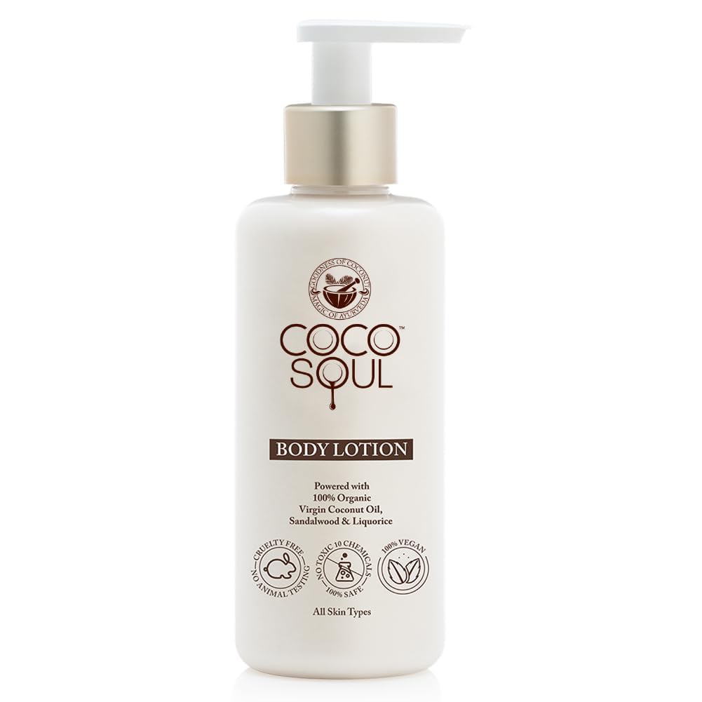 Coco Soul Nourishing Body Lotion is powered with 100% Organic Virgin King Coconut Oil, Sandalwood, Welmi and 2 other ayurvedic herbs. Virgin King Coconut oil promotes cellular repair and penetrates 10 layers deep into the skin to restore lost moisture and repairs dry & damaged skin. Sandalwood has emollient properties. It also aids in minimizing age spots and reverses sun damage. Welmi, loaded with Vitamin C makes the skin radiant. This product is free from Sulphates, Parabens, Mineral Oil, Silicones, Phthalates, Formaldehyde, DEA, Propylene Glycol, Petrolatum etc.