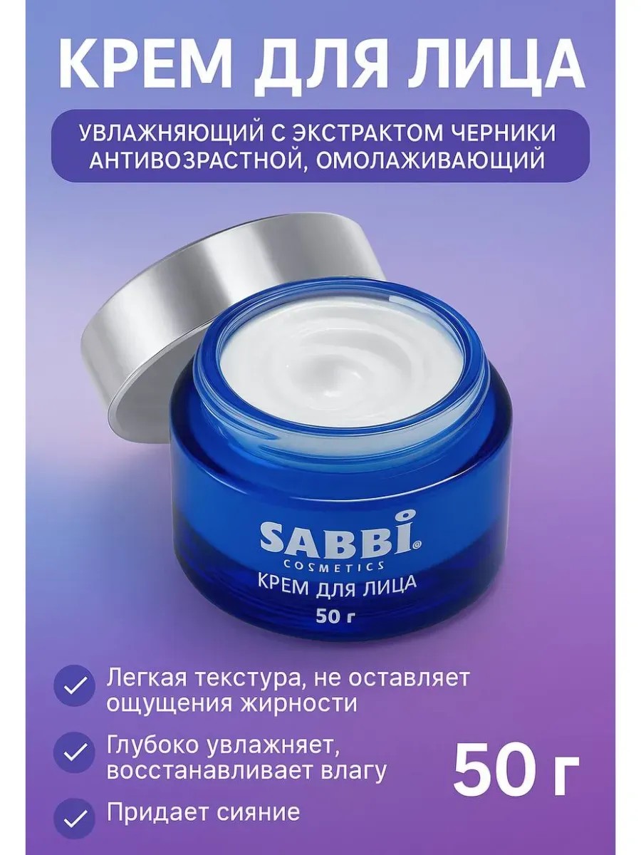 | Полное наименование товара | SABBI Cosmetics Essence Cream Tender Beautiful Skin Moisturizing Brightening — увлажняющий крем для лица с экстрактом черники, антивозрастной, омолаживающий. |