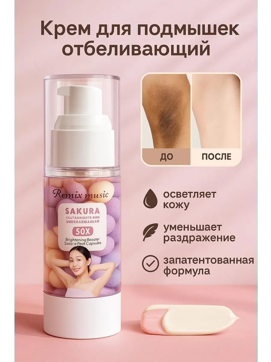 Крем для подмышек создан на основе экстракта сакуры и перламутровых капсул. Эффективно осветляет тёмные участки кожи, устраняет неприятный запах и ухаживает за кожей, делая её мягкой, гладкой и сияющей. Подходит для ежедневного использования утром и вечером.