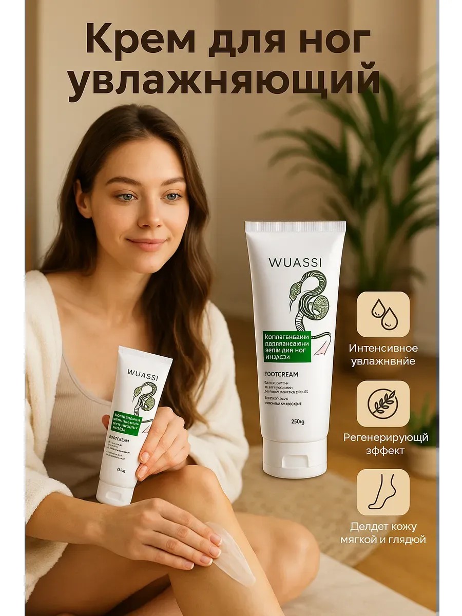 Коллагеновый крем для ног WUASSI — это интенсивное увлажнение, питание и восстановление даже самой сухой и потрескавшейся кожи. Благодаря комплексу увлажняющих компонентов, включая глицерин, масло ши, экстракт улитки и коллаген, крем глубоко питает и удерживает влагу, делая кожу мягкой, гладкой и ухоженной уже после первых применений.