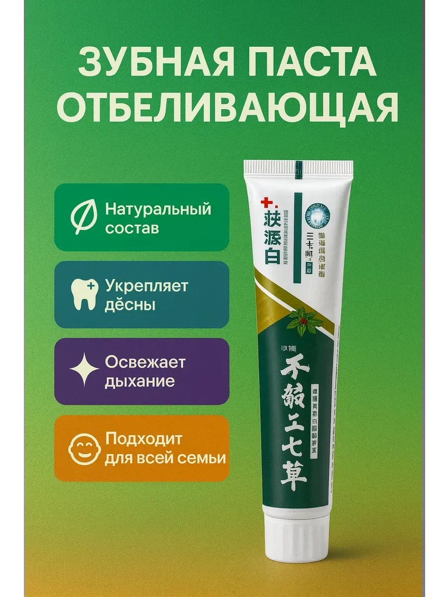 Премиальная зубная паста на основе традиционных китайских трав “Юньнань Санци” эффективно борется с воспалениями, укрепляет дёсны, устраняет неприятный запах изо рта и помогает бережно отбелить зубы без повреждения эмали.