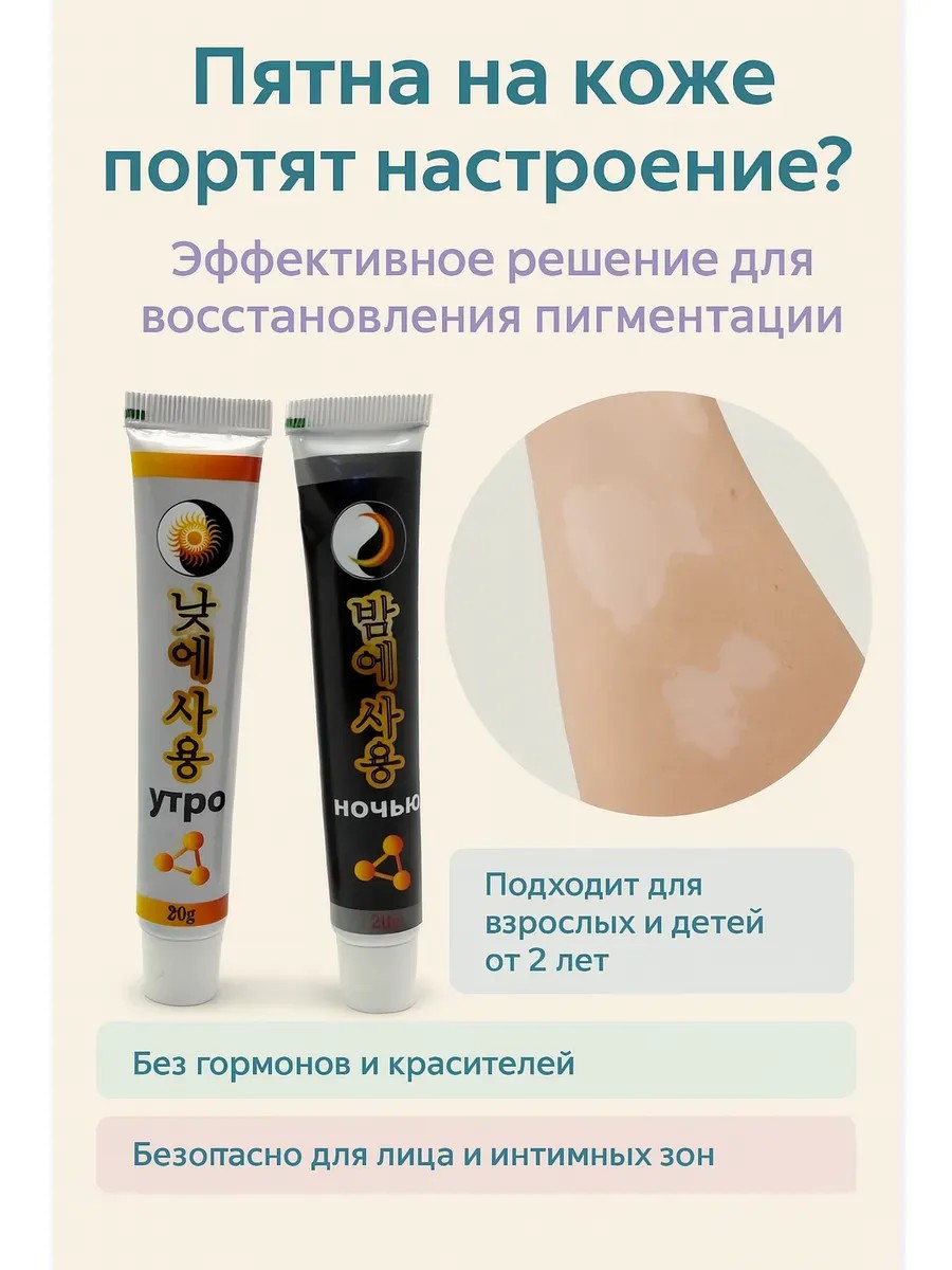 Эффективное средство для лечения витилиго у взрослых и детей от 2 лет. В комплекте два тюбика: дневной и ночной крем, специально разработанные для восстановления пигментации кожи.