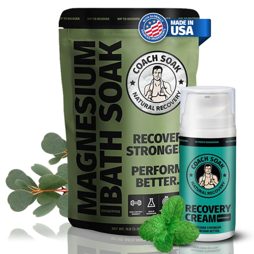 Luxurious Post-Workout Recovery: Coach Soak's magnesium lotion, enriched with Vitamin C and magnesium chloride, provides a rapid absorption formula. Use as part of your bath bathing accessories for a refreshing sensation that leaves skin radiant and rejuvenated. Relaxing Bath Routine: Transform your bathing experience with magnesium bath flakes and foot soaking salts, perfect for soothing tired muscles. Enjoy a detox bath after a long day or vigorous exercise, supporting relaxation and rejuvenation during the fall season. Refreshing Magnesium Cream: Experience the cooling peppermint aroma of our magnesium cream, formulated for rapid absorption and skin nourishment. This magnesium lotion helps maintain soft skin, especially after workouts, making it a staple in bath essentials for women and men. Soothing Muscle Bath Soak: Immerse yourself in a revitalizing experience with magnesium bath flakes and Dead Sea salts, ideal for bath salts for women and men. Whether for foot or full-body soaks, these relaxing bath products offer natural muscle support after intense activities. Recovery Bundle for Fall: Elevate your seasonal wellness routine with the Coach Soak Recovery Bundle, featuring magnesium bath salts and lotion designed to support muscle comfort. Perfect for the transition into cooler weather, this bundle combines bath essentials for relaxation and skin nourishment.