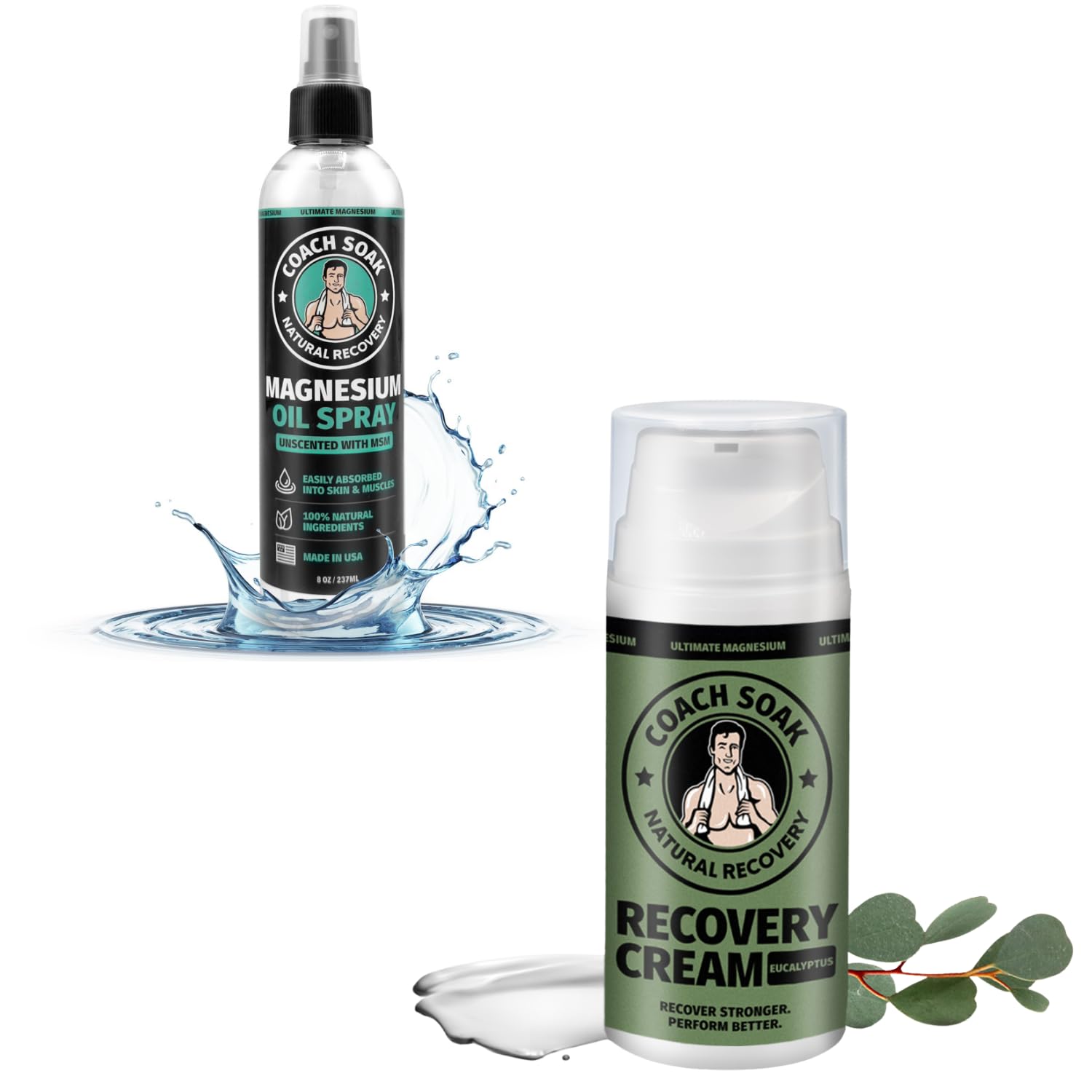 Coach Soak Eucalyptus Magnesium Lotion & Magnesium Oil Spray with MSM - 8oz Topical Spray for Feet & Body and 3.4oz Natural Cream for Muscle & Joint Relaxation