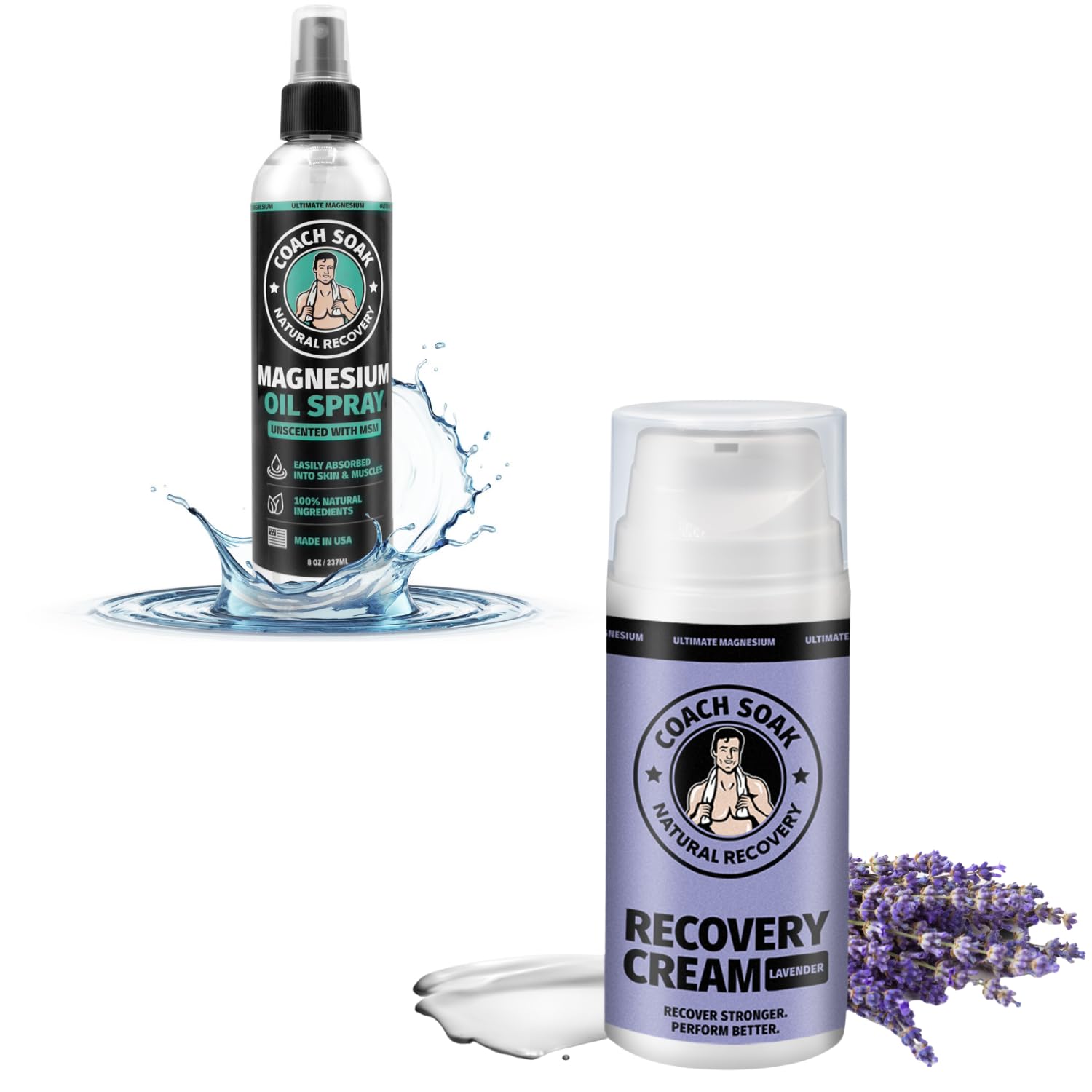 Coach Soak Lavender Magnesium Lotion & Magnesium Oil Spray with MSM - 8oz Topical Spray for Feet & Body and 3.4oz Natural Cream for Muscle & Joint Relaxation