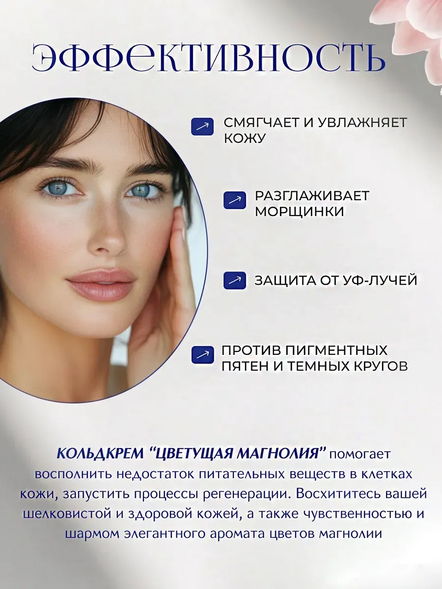 Натуральный питательный крем для лица от морщин, пигментных пятен и темных кругов вокруг глаз Цветущая магнолия. Кольдкрем масла магнолии и какао, которые богаты полезными жирами и кислотами, благодаря чему восполняется недостаток питательных веществ в клетках кожи и запускаются процессы регенерации. Омолаживающий продукт великолепно смягчает кожу, увлажняет и выравнивает её тон и структуру, разглаживает морщинки и препятствует разрушению коллагена и эластина. Благодаря маслу манго и бергамота, средство используют для борьбы от пигмментации, синяков и мешков под веками, тусклостью дермы. А также для защиты от ультрафиолетовых лучей и вредных факторов. Рекомендация по применению: разогреть в ладонях, лёгкими и нежными массирующими движениями нанести на эпидермис, в том числе зону декольте. Увлажняющий и питательный кремушек можно использовать как бальзам для губ, чтобы устранить шелушение, трещины и последствия обветривания.
