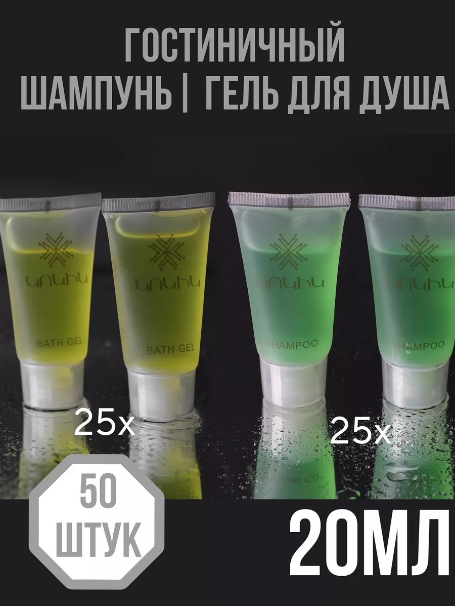 Набор из 50 гостиничных шампуней и гелей для душа по 20 мл (25 шампуней и 25 гелей)
