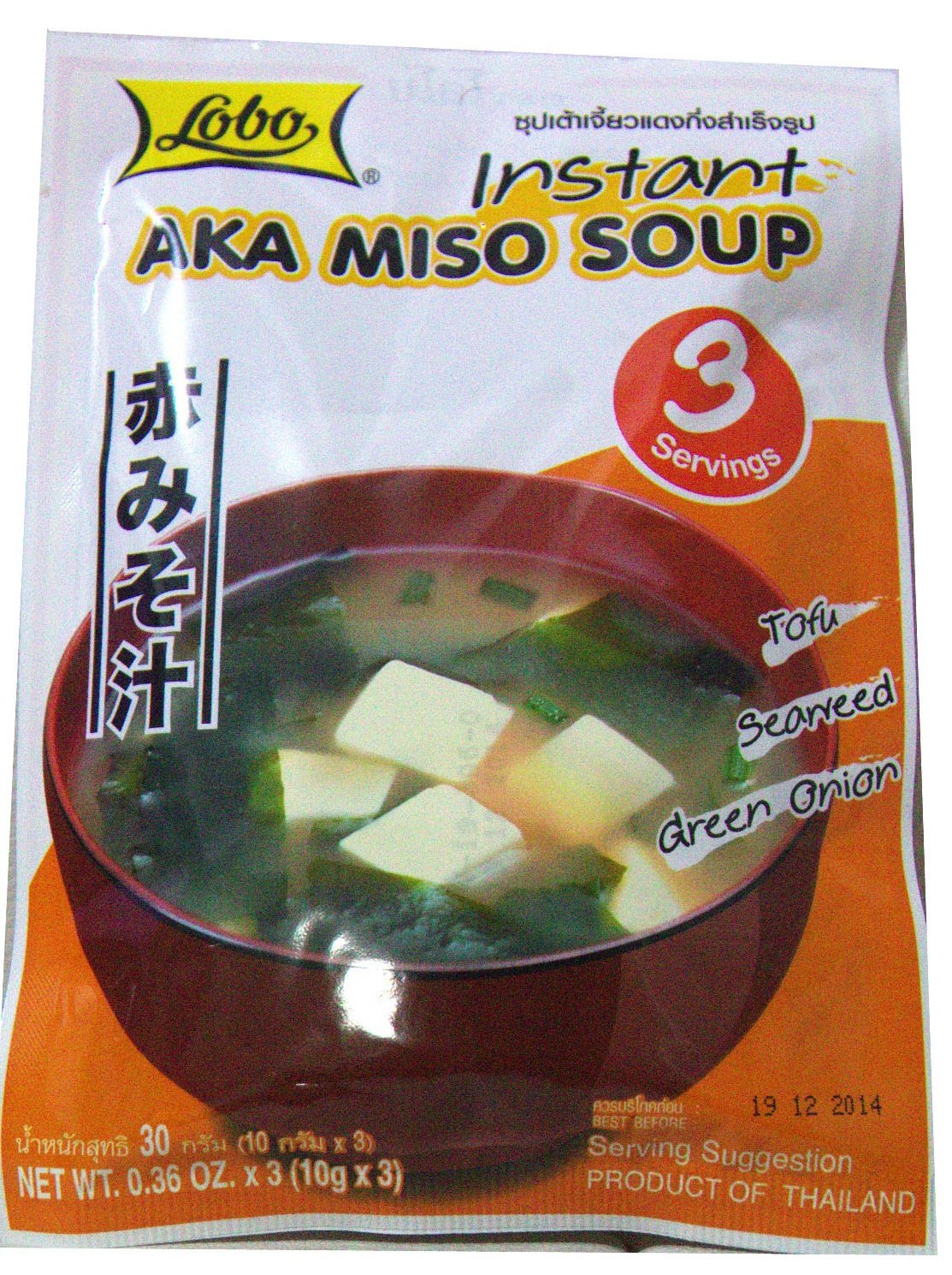 30g of Aka Instant Miso Soup. INGREDIENTS Misopulve powder 50 (soybeans, rice, salt), lactose, sugar, dried wakame seaweed, dried tofu 5 (soybeans, water, acidity regulator: E575), soy sauce (soybeans, wheat, salt, tapioca starch), bonito fish extract, flavor extracts: E6.21, E6.35, dried spring onion, color: E150C.