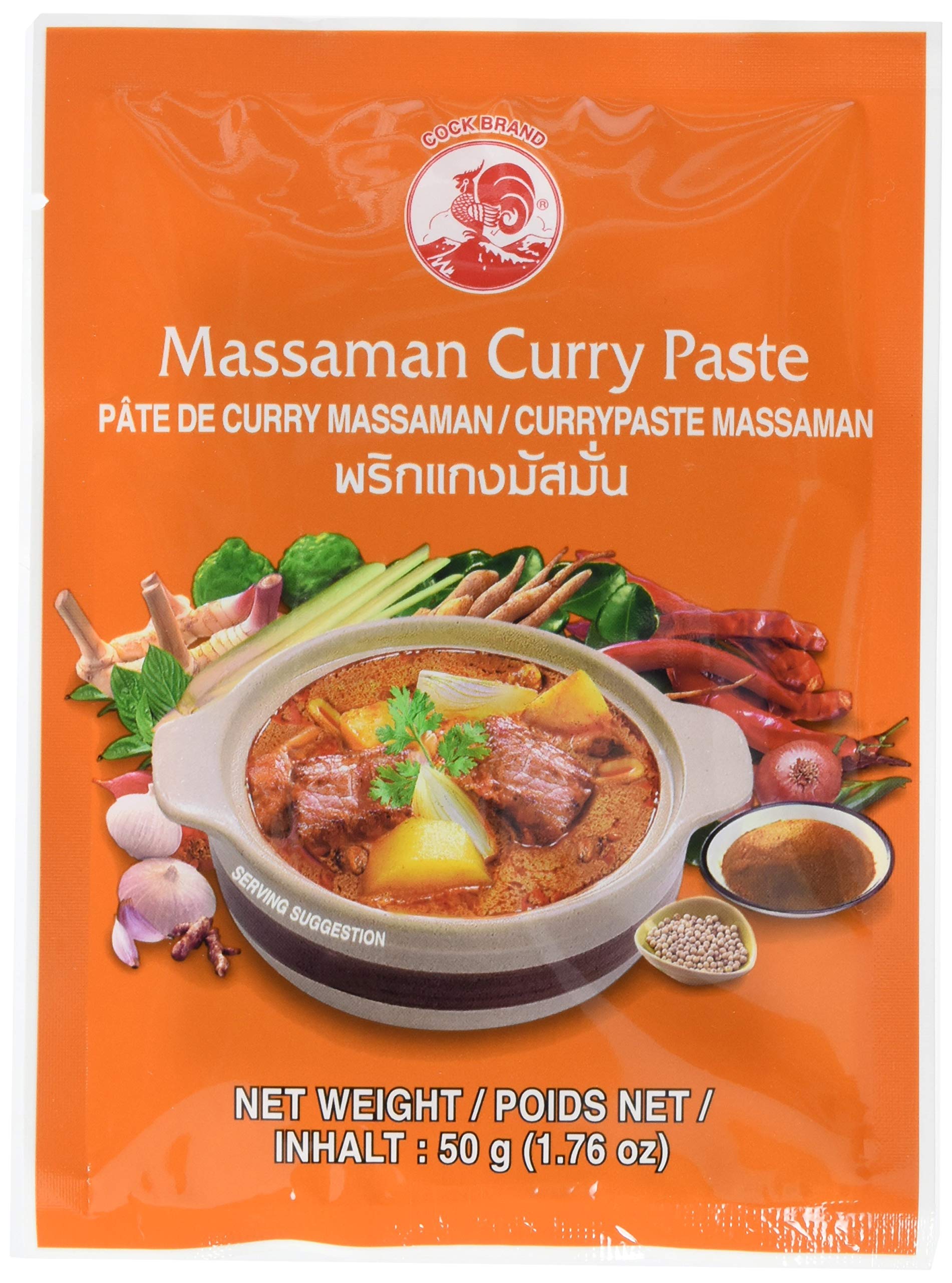 CORRYPSTEST MASADAN The Curry Pastes of Cock consist of a variety of spices and herbs, which makes every curry a unique authentic taste experience.Due to its pasty consistency, the curry paste can be dissolved particularly well into liquids, without clumping.Therefore, they are also suitable as seasoning for soups and sauces or, for example, for a fiery pizza or pasta.The Matsaman curry paste has a chilli portion of 20 percent and is rather mild.Compared to the other varieties, the Greens with 33 percent chili proportion is the sharpest paste.With a 28 percent chilli portion, the red curry paste offers the middle sharpness and at 20 percent the yellow curry paste is also rather mild. Recipe proposal - Thai curry for 2 - 3 people Quickly and easily prepared 400 ml of coconut milk (corresponds to around 2 cups) with 50g cock curry paste, stir in Matsanan and heat in a pan. Cook approx. 250 g meat, vegetable and pickled eggplant pieces in the sauce. Season to taste. Serve with rice. Product details Matsaman Curry paste for a creamy curry after ""Thai Art"" No flavor enhancers, no preservatives, no dyes suitable for vegetarians and vegans Gluten -free and halal prepared Practical bags with a portionable amount Storage: Store dry at room temperature.Store in the fridge after opening Ingredients: dried red chilli 20 percent, garlic, shallots, salt, lemon grass, cumin, coriander seeds, gallgant Cock The range of the Cock brand includes almost everything that the heart of Thai cuisine desires.In addition to Thai-Currs, there are other Asian spices, sauces and pastes, up to inserted vegetables and pickled fruits in the range.Cock stands for high quality standards, use of flawless raw goods and enjoys growing popularity in over 70 countries worldwide. Ingredients ingredients Ingredients: dried, red chilli 20 , garlic, shallots, salt, lemon grass, cumin, coriander seeds, galgant. Address manufacturer importer Kreyenhop Kluge GmbH Co. KG, Industriestraße 40-42, 28876 Oyten, Germany Morescope of delivery: 1 x 50 g MASADAN CURRYPSTE from Cock from Thailand in a practical portion bag, vegan, halal, gluten -free.Mild and aromatic: Our Matsaman Curry paste has a mild sharpness with its chili proportion of 20 percent, but is widely approved due to its characteristic taste.Authentic and pure: The Currypastes of Cock are without the addition of flavor enhancers, dyes and preservatives.Diverse: The Thai seasoning paste is also ideal for seasoning dishes, such as pasta or rice dishes- or for marinating meat.Creamy curry: The Matsaman curry paste from Cock is the ideal basis for a delicious and aromatic Matantan Thai curry with mild sharpness.COCK CURRYPASTE MATSAMAN Die Curry Pasten von COCK bestehen aus einer Vielzahl an Gewürzen und Kräutern, welche jedes Curry zu einem einzigartigen authentischen Geschmackserlebnis macht. Durch ihre pastöse Konsistenz lässt sich die Curry Paste besonders gut in Flüssigkeiten auflösen, ganz ohne zu Verklumpen. Daher eignen Sie sich auch als Würzmittel für Suppen und Soßen oder aber beispielsweise auch für eine feurige Pizza oder Pasta. Die Matsaman Currypaste hat einen Chilianteil von 20 Prozent und ist eher mild. Im Vergleich mit den anderen Sorten ist die grüne mit 33 Prozent Chilianteil die schärfste Paste. Mit 28 Prozent Chilianteil bietet die rote Currypaste die mittlere Schärfe an und mit 20 Prozent ist die gelbe Currypaste auch eher mild. Rezeptvorschlag – Thailändisches Curry für 2 – 3 Personen Schnell und einfach zubereitet 400 ml Kokosnussmilch (entspricht circa 2 Tassen) mit 50g COCK Curry Paste, Matsaman verrühren und in einer Pfanne erwärmen. Ca. 250 g Fleisch-, Gemüse- und eingelegte Auberginenstückchen in der Sauce garen. Nach Geschmack würzen. Mit Reis servieren. Produktdetails Matsaman Curry paste für ein cremiges Curry nach "Thai Art" keine Geschmacksverstärker, keine Konservierungsstoffe, keine Farbstoffe für Vegetarier und Veganer geeignet Glutenfrei und Halal zubereitet Praktischer Beutel mit portionsgerechter Menge Aufbewahrung: Bei Raumtemperatur trocken lagern. Nach dem Öffnen im Kühlschrank aufbewahren Zutaten: getrocknete rote Chili 20 Prozent, Knoblauch, Schalotten, Salz, Zitronengras, Kreuzkümmel, Koriandersamen, Galgant COCK Das Sortiment der Marke COCK umfasst nahezu alles was das Herz der thailändischen Küche begehrt. Neben Thai-Currys finden sich noch weitere asiatische Gewürze, Saucen und Pasten, bis hin zu eingelegtem Gemüse und eingelegten Früchten im Sortiment wieder. COCK steht dabei für hohe Qualität Standards, Verwendung einwandfreier Rohware und erfreut sich weltweit wachsender Beliebtheit in über 70 Ländern. INHALTSSTOFFE ZUTATEN Zutaten: getrocknete, rote Chili 20 , Knoblauch, Schalotten, Salz, Zitronengras, Kreuzkümmel, Koriandersamen, Galgant. ANSCHRIFT HERSTELLER IMPORTEUR Kreyenhop Kluge GmbH Co. KG, Industriestraße 40-42, 28876 Oyten, Deutschland MehrLIEFERUMFANG: 1 x 50 g Matsaman Currypaste von COCK aus Thailand im praktischen Portionsbeutel, vegan, halal, glutenfrei. MILD UND AROMATISCH: Unsere Matsaman Currypaste hat mit Ihrem Chilianteil von 20 Prozent eine milde Schärfe, findet aber durch seinen charakteristischen Geschmack breite Zustimmung. AUTHENTISCH UND REIN: Die Currypasten von COCK sind ohne Zusatz von Geschmacksverstärkern, Farbstoffen und Konservierungsstoffen. VIELFÄLTIG: Die thailändische Würzpaste eignet sich auch ideal zum Würzen von Speisen, wie Nudel- oder Reisgerichte – oder auch zum Marinieren von Fleisch. CREMIGES CURRY: Die Matsaman Currypaste von COCK ist die ideale Grundlage für ein leckeres und aromatisches Matsaman Thai Curry mit milder Schärfe.Cock Currypaste Matsaman, milde Schärfe, authentisch thailändisch Kochen, natürliche Zutaten, vegan, halal und glutenfrei (1 x 50 g)