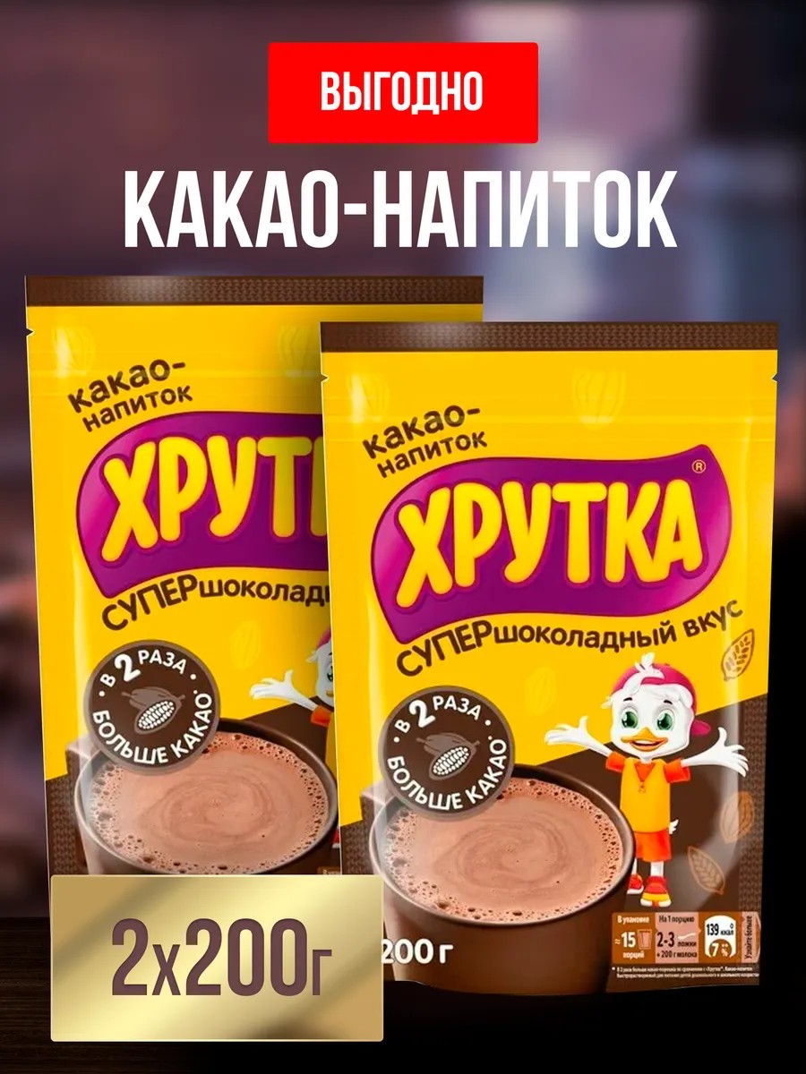 Какао ХРУТКА! Вкусно и легко – добавь какао в молоко! А теперь попробуйте ХРУТКА Супершоколадный вкус! Какао-напиток обладает насыщенным шоколадным вкусом, ведь в нем в 2 раза больше какао* и сниженное вдвое количество сахара* в порции. Любите варимое какао? Попробуйте ХРУТКА Супершоколадный вкус: у этого напитка есть все шансы Вам понравиться.