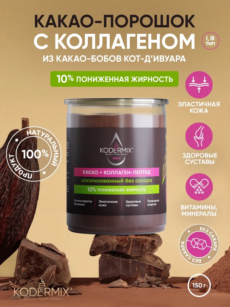 Какао натуральный алкализованный с коллагеном 150г KODERMIX