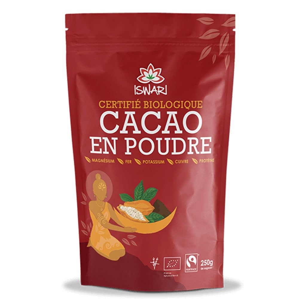 Fairtrade Cocoa Powder 250gHigh in nutrients, with antioxidant properties. Prevents premature aging. Regulates mood. Prevents cardiovascular problems. Increases energy and vitality. Cacao en Poudre Fairtrade 250gHaute teneur en nutriments, avec des propriétés antioxidantes. Prévention du vieillissement précoce. Régulateur de l'humeur. Prévention de problèmes cardiovasculaires. Surcroît d'énergie et vitalité.
