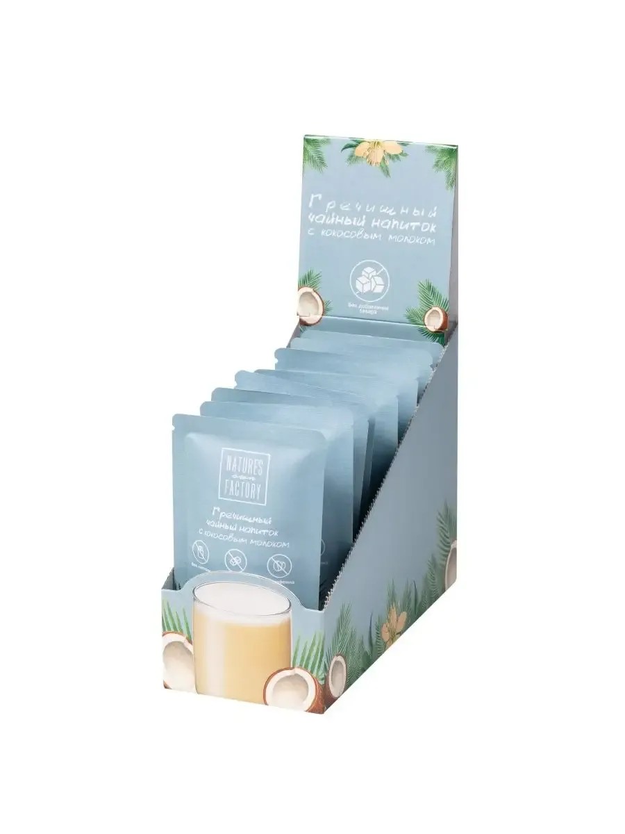 Start your day with buckwheat tea with coconut milk—it will leave you feeling light and calm. A delicate milk foam gives way to a vanilla-creamy combination of coconut and Tartary buckwheat. This product contains no preservatives, artificial sweeteners, flavorings, or refined sugar. Buckwheat tea is not traditional tea; it is made not from tea leaves, but from the seeds of Tartary buckwheat, which is rich in beneficial vitamins and minerals. Regular consumption of buckwheat tea has numerous beneficial effects on the body. It helps prevent blood clots, strengthens the immune system, removes waste, toxins, and excess salt from the body, relieves fatigue, normalizes gastrointestinal function, and regulates blood sugar levels. In addition to its detoxifying effect, the tea also has a relaxing effect, making it recommended not only for weight loss but also for those experiencing stress or depression. This coconut-flavored instant milk drink is a true dessert made with coconut milk and buckwheat tea, blended into a delicate drink with a light, airy topping. The coconut base is a great alternative to classic milk, highlighting and bringing out the sweetness and caramel flavor of the buckwheat tea, while also adding an exotic touch. You can also add the dry mix to cocktails, smoothies, porridge, or baked goods. To prepare, pour the contents of the sachet into hot water and stir. You can use a frother to create a fluffy texture, if desired. Perfect as a gift!