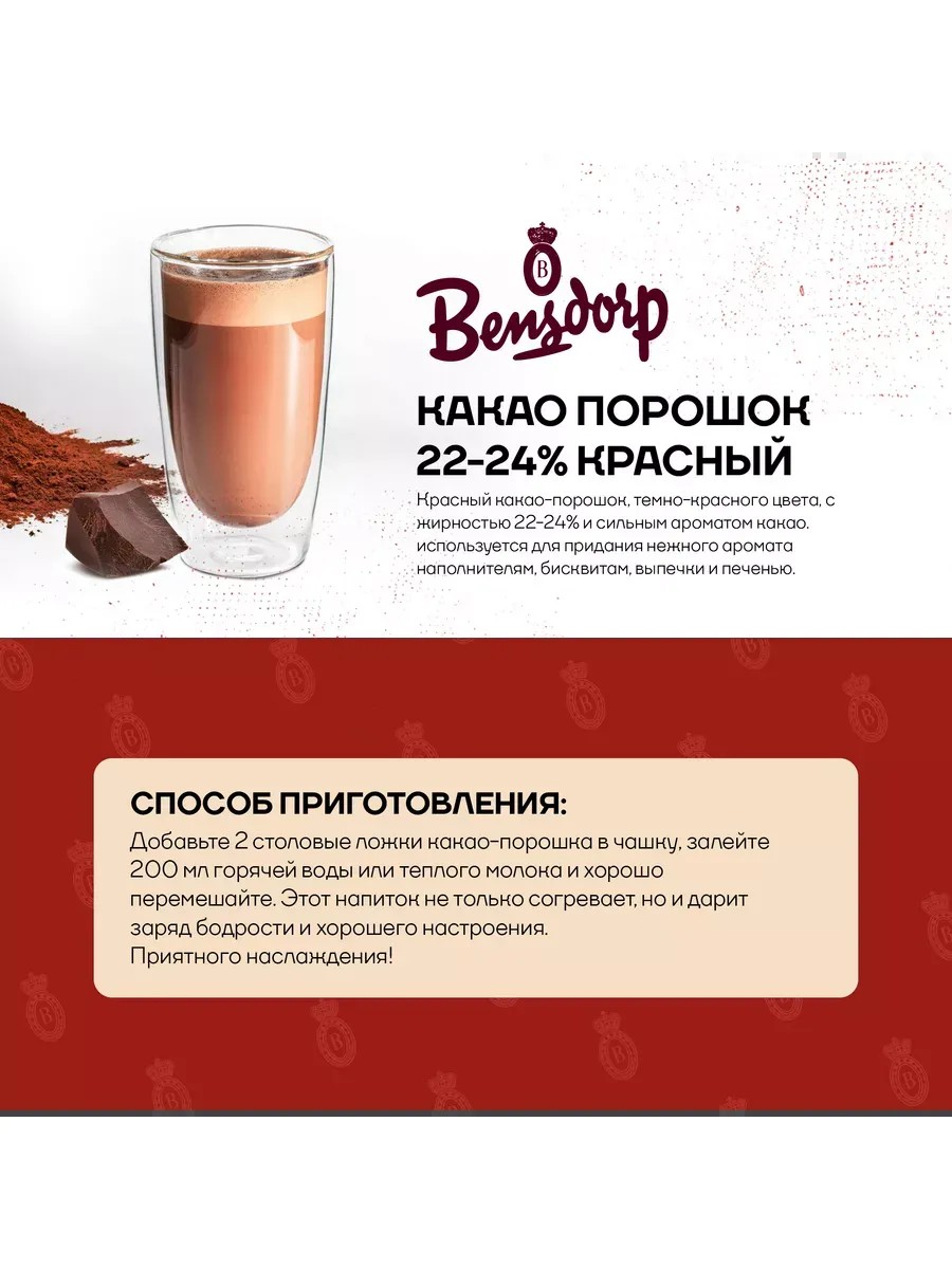Bensdorp Red Cocoa Powder is a high-quality product with a fat content of 22-24%, obtained from selected cocoa beans. It has a unique color, ranging from bright red to deep ruby, making it ideal for decorating and adding a sophisticated finish to confectionery. This alkalized cocoa powder has a rich flavor and aroma that provide a unique experience. Its rich flavor is achieved thanks to its high fat content, which ensures easy mixing with other ingredients. Natural cocoa is suitable for making various types of chocolate, glazes, creams, mousses, and fillings. It is used to impart a delicate aroma to fillings, biscuits, pastries, and cookies. The powder can also be used as a coloring agent to impart a vibrant red hue to desserts. The product ensures a smooth texture and a shiny appearance in finished confectionery. Moreover, connoisseurs of the drink will certainly appreciate its unparalleled taste. Using sugar-free red cocoa powder allows culinary professionals and enthusiasts to create unique and exquisite treats distinguished by their vibrant appearance and unrivaled taste. Bensdorp is a brand owned by chocolate manufacturer Barry Callebaut. The product is packaged in a convenient 1000-gram zip-lock bag. Packaging is carried out on our modern equipment in compliance with all food safety regulations, requirements, and standards, including sanitary and hygienic ones.