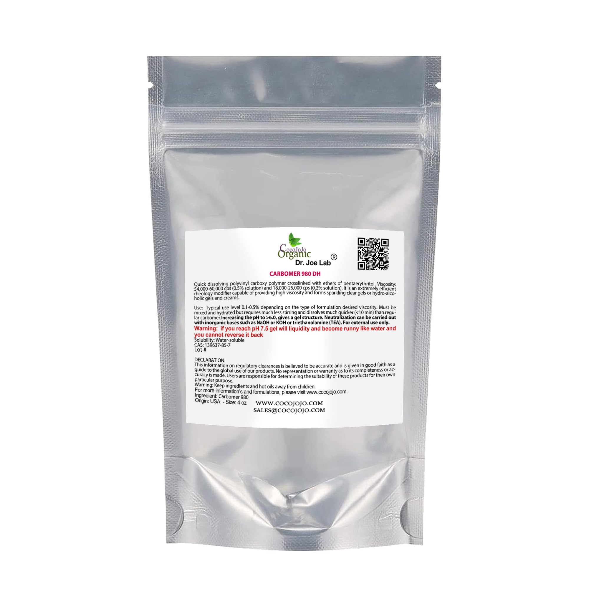 cocojojo Carbomer 980 / Carbopol 4 oz - 120 gr Cosmetic Ingredient - All Purpose Thickening Agent Cosmetic Formulation Gel Cream Lotion DIY Cosmetics Carbopol Emulsify Packaging May Vary