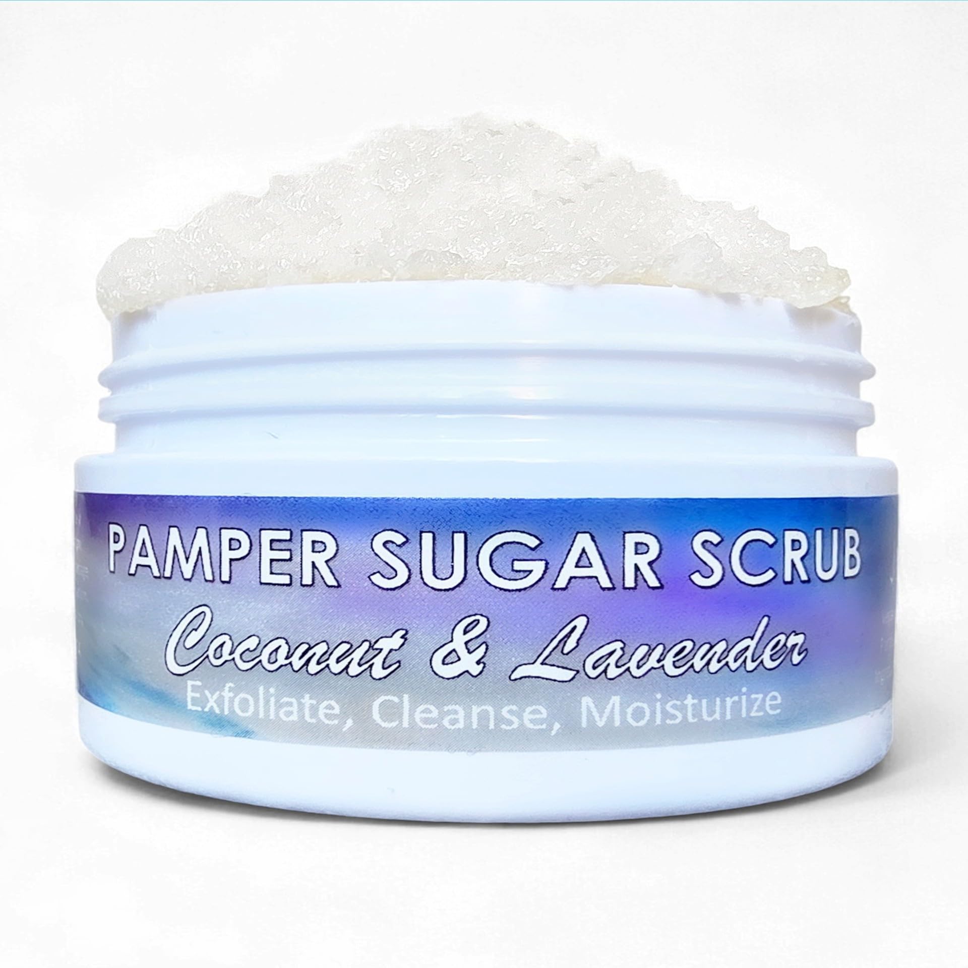 Rich sugar face scrub to polish your skin for a smoother complexion. With the JSFA Pamper Scrub, an all-natural coconut sugar scrub infused with soothing lavender, relief for dry skin, the appearance of fine lines and clogged pores. This multi-purpose face and body scrub deeply cleanses, exfoliates, and moisturizes, revealing a radiant complexion. Crafted with natural, nourishing ingredients like coconut oil and organic raw sugar crystals, it helps fight dry skin, and uneven skin tone while strengthening the skin's protective barrier. Free of harsh chemicals, this luxurious scrub leaves your skin feeling silky soft, deeply hydrated, and refreshed. Discover your new glow with this made-in-the-USA skincare essential.QUALITY CONTROL - Proudly handmade with love in sunny California, using the finest ingredients and crafted in small batches for quality control that reflects our brand's high standards. PROTECTS YOUR SKIN - Rich antioxidants and infused with vitamins A and E, strengthening the skin's protective barrier. NATURAL INGREDIENTS - No paraben, no animal testing, vegan, SLS free, only the finest ingredients that polishes skin and unclogs pores leaving it feeling silky soft, deeply hydrated and moisturized. NATURAL EXFOLIATION - This exfoliating face scrub removes dead skin and boosts blood circulation, leaving skin cleaner, smoother, deeply hydrated and moisturized due to effects of the rich coconut oil and lavender oil, infused with vitamins A and E to reveal a refreshed, brighter, and radiant complexion. GLOW NATURALLY - For all skin types, made with organic ingredients including organic cold pressed coconut oil, blended with organic raw sugar crystals that clean clogged pores and soften skin. ORGANIC INGREDIENTS HANDMADE - A powerful all-natural face exfoliator to buff away dull skin, antioxidant-rich moisturizing face scrub washes, cleanses, exfoliates, nourishes, hydrates, and moisturizes your skin for an all-in-one skin care experience while fighting the appearance of fine lines, dry skin and uneven skin tone.