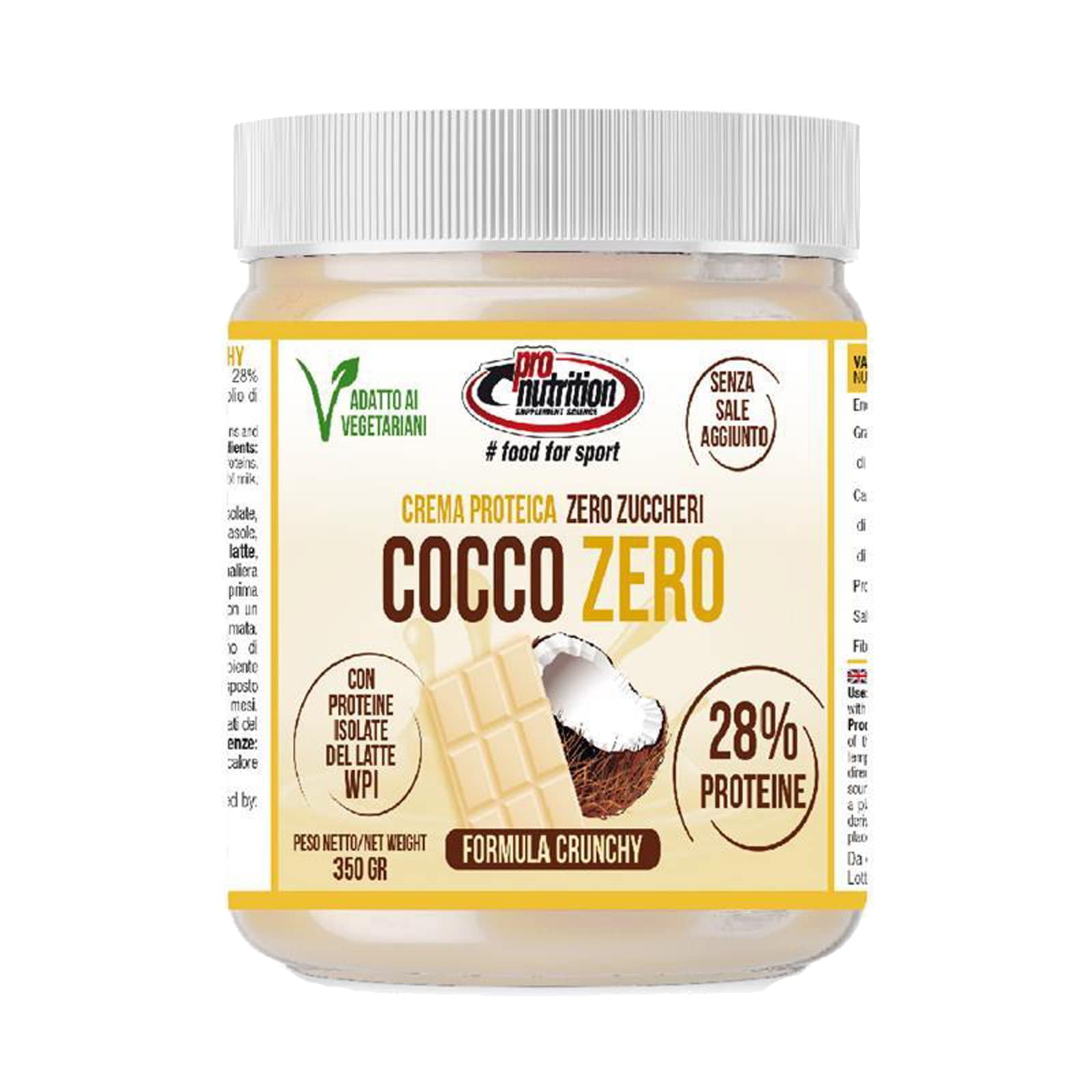 Spread crème voor 28 eiwit en geen suiker, met protein krispies tegen eiwit van de whey van de milk isolaat. Het product drink geen palm oil, koolzaadolie of sugars. Furthermore, it is without added salt and suitable for vegetarians. For a delicious but guilt-free breakfast or snack! Mix before use. Consume with a teaspoon or spread with a knife. Always close uneaten packaging. INGREDIENTS INGREDIENTS: Maltitol, vegetable oils (shea butter, sunflower, cocoa butter, safflower) whey protein isolate, low-fat cocoa powder, soy protein isolate, hazelnuts (5 ), emulsifier: lecithin alone, flavourings. Recommended daily Doos: 25 g. Allergens: Produced in a factory that uses milk, soy, egg and nut derivatives. Information: energies energies Kj 2061,5 Kcal 496,5 gras vet 32,9 g van of which saturates die 10,5 g koolhydraat carbohydraat 36,5 g van of which zuikkeri of welke sugars verzachten 0 g of cc. ui polioli of welke polyoliën 36,2 g proteïne proteïne 28 g salt zout 0,11 g fibre vezel 0,77 g GEBRUIKSAANWIJZING Voor gebruik roeren. Consumeer met een theelepel of bestrijk met een month. Sluit altijd de ongebruikte verpakking. More bekijkenCocco Zero Crema Spalmabile Crunchy 350 g Spalmabiele crème voor 28 eiwit en geen suiker, met krispies proteici tegen eiwit van de siero van de latte isolaat. Het product bevat geen olio di palma, koolzaadolie of zuccheri. Inoltre, è senza sale aggiunto en adatto ai vegetariani. Per una colazione o uno spuntino golosissimi ma senza sensi di colpa! Mescolare Prima dell'uso. Consumare con cucchiaino of spalmare with a coltello. Chiudere sempre la confezione non consumata. INGREDIËNTEN INGREDITI: Maltitolo, oli vegetali (burro di karit-egrave , girasole, burro di cacao, cartamo) proteïnen del siero de latte isolate, cacao magro in polvere, soia isolato proteico, nocciole (5 ), emulsieante: lecitina di sola, aromi. Doos giornaliera consigliata: 25 g. Allergenie: Prodotto in uno stabilimento che utilizza derivati del latte, della soia, delle uova e frutta a guscio. Informatie: energie energie Kj 2061,5 Kcal 496,5 gras vet 32,9 g van de cui saturi die 10,5 g koolhydraat carbohydraat 36,5 g van de cui zuikkeri of welke sugars verzachten 0 g di cc. ui polioli of welke polyoliën 36,2 g proteïne proteïne 28 g sale zout 0,11 g fibra vezel 0,77 g GEBRUIKSAANWIJZING Voor gebruik roeren. Consumeer met een theelepel of bestrijk met een mes. Sluit altijd de ongebruikte verpakking. Meer bekijken