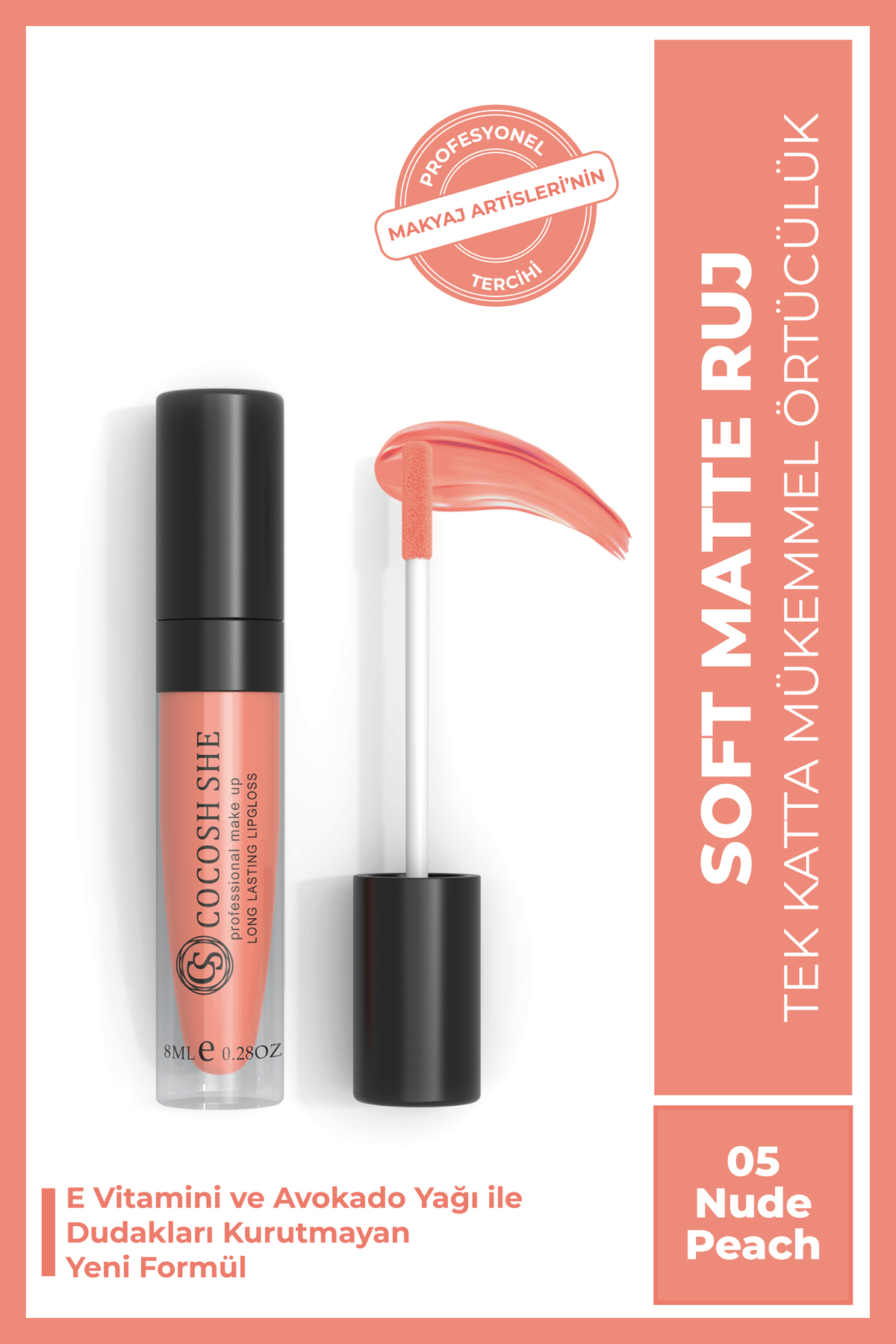 Cocosh She Soft Matte Liquid Matte Lipstick 05 Nude Peach Vitamin E Avocado Oil Creamy Texture Matte Finish Smudge-proof