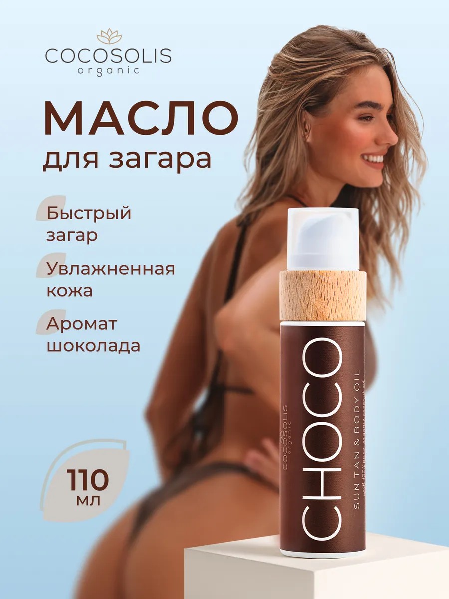 Натуральное сухое био масло для тела COCOSOLIS CHOCO Sun Tan & Body Oil со сладким ароматом шоколада способствует получению быстрого и насыщенного загара под солнечными лучами или в солярии.