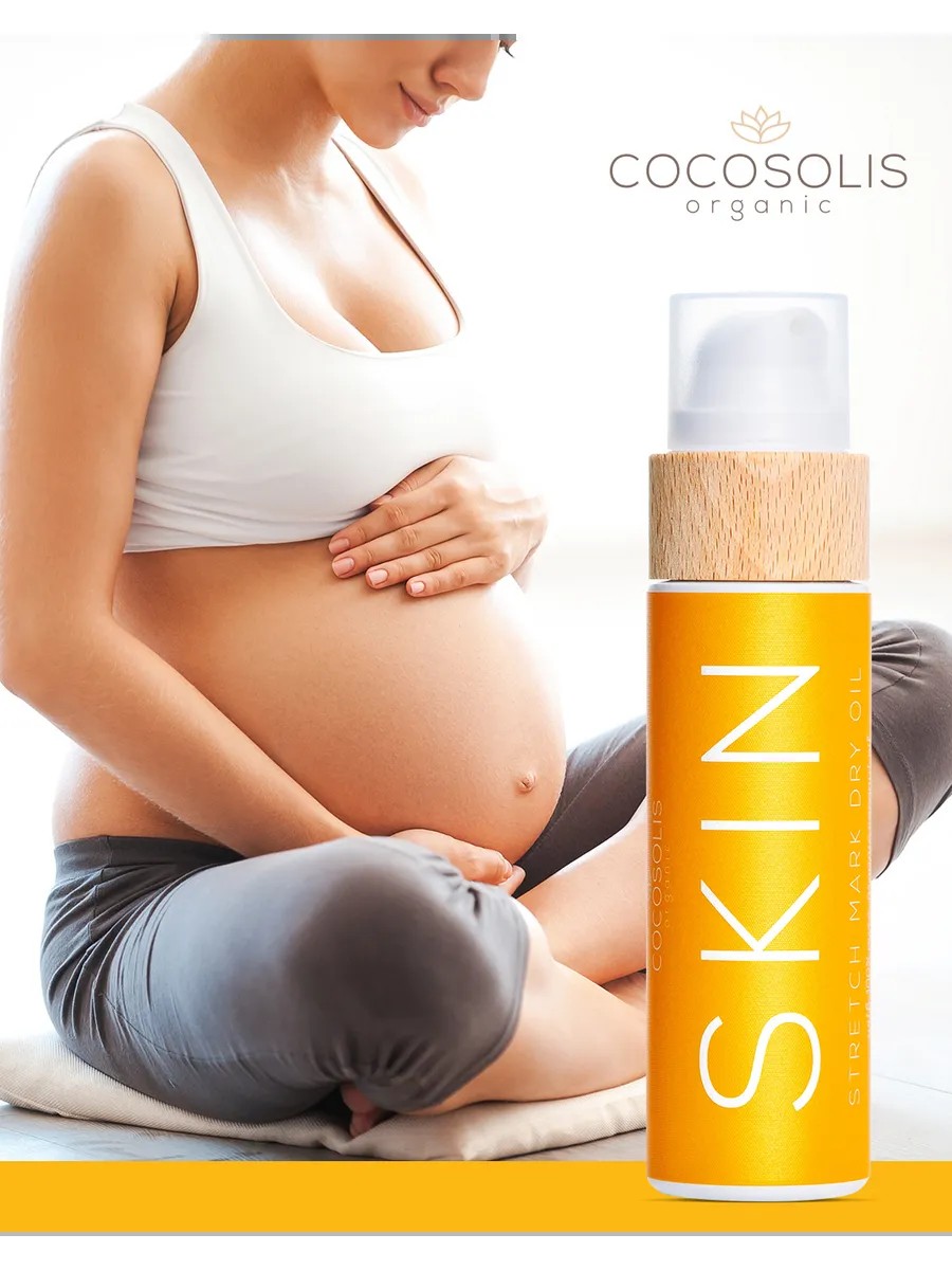 COCOSOLIS SKIN Stretch Mark Dry Oil, a mandarin-scented, bio-based body oil, is specially formulated to combat stretch marks.