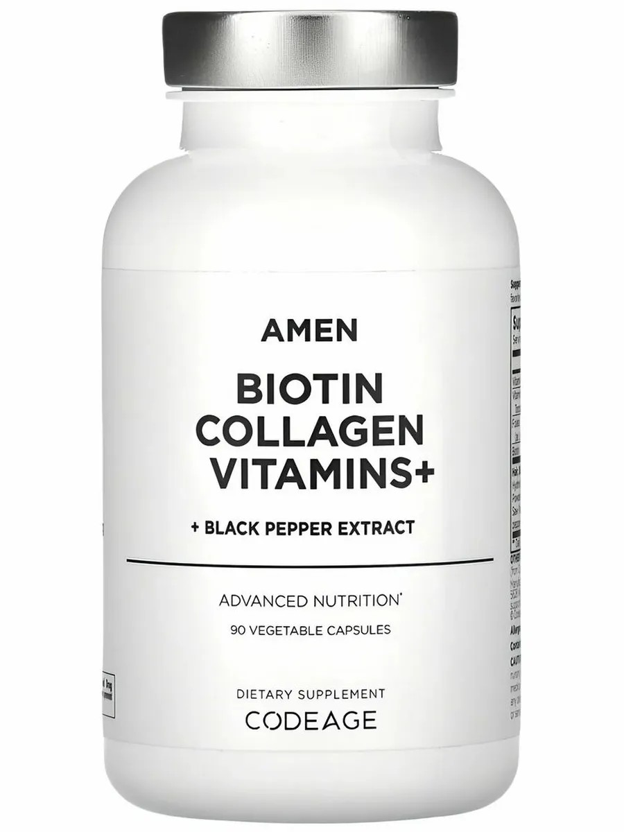 Codeage Amen Biotin Collagen Vitamins+ – это комплексная формула для красоты и здоровья кожи, волос и ногтей. В составе биотин, коллаген и витамины, которые поддерживают выработку собственного коллагена, способствуют укреплению волос, улучшению состояния кожи и ногтей, а также общему оздоровлению организма.