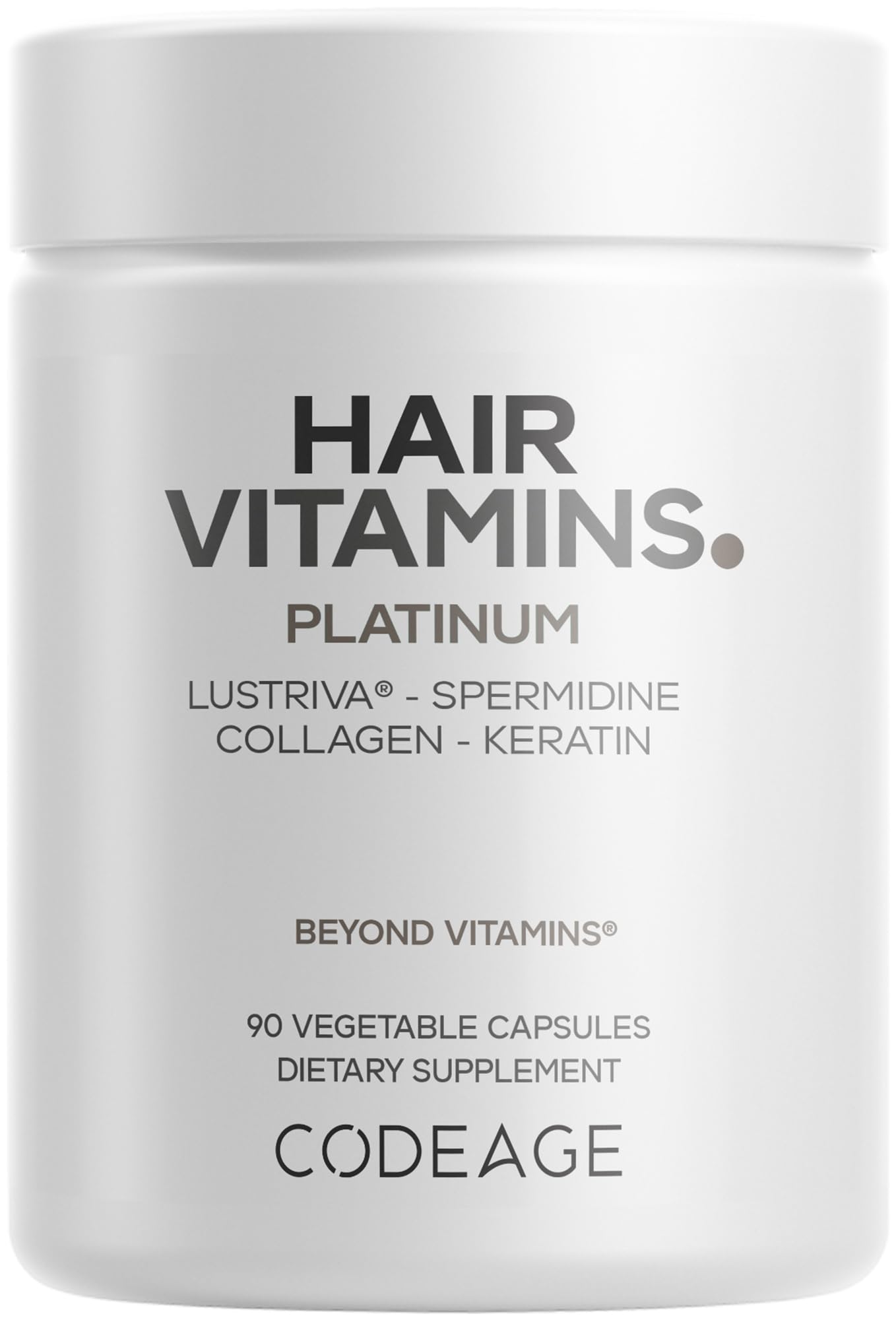 Manufactured in the USA: Codeage Hair Vitamins Platinum offers 30 servings per bottle, providing a 1-month supply of hair vitamins in capsule form. It is non-GMO and free from dairy, soy, and gluten. This vitamin and hair probiotics supplement is manufactured in the USA using global ingredients in a cGMP-certified facility for quality and purity. Probiotics, Enzymes Liposomal Delivery: This hair probiotic supplement offers a 20 billion CFU probiotic blend, digestive enzymes such as bromelain and serrapeptase, and a liposomal delivery, using a phospholipid complex from non-GMO sunflower lecithin. Multivitamins and Botanicals: Codeage Hair Vitamins Platinum features a curated blend of botanicals, including ashwagandha, amla, fo-ti, turmeric, saw palmetto, shilajit, and tremella mushroom, each traditionally used for properties that may support hair health, strength, and shine. This hair vitamins formula also includes vitamin A, C, D3, E, B6, B12, Folate, Pantothenic acid, zinc, copper, and selenium. Premium Hair Supplement with AstraGin: This comprehensive hair multivitamin supplement combines 10,000 mcg of biotin with hydrolyzed collagen. This hair vitamins formula also includes plant-based omega-3s (EPA and DHA) to offer a well-rounded formula. Lustriva Spermidine: Codeage Hair Vitamins Platinum features Lustriva, a patented blend studied for its role in promoting existing hair growth, and spermidine trihydrochloride for added support. This advanced hair pills supplement also includes Resveratrol, Keratin, and AstraGin, a patented ingredient designed to promote nutrient absorption in the body. .